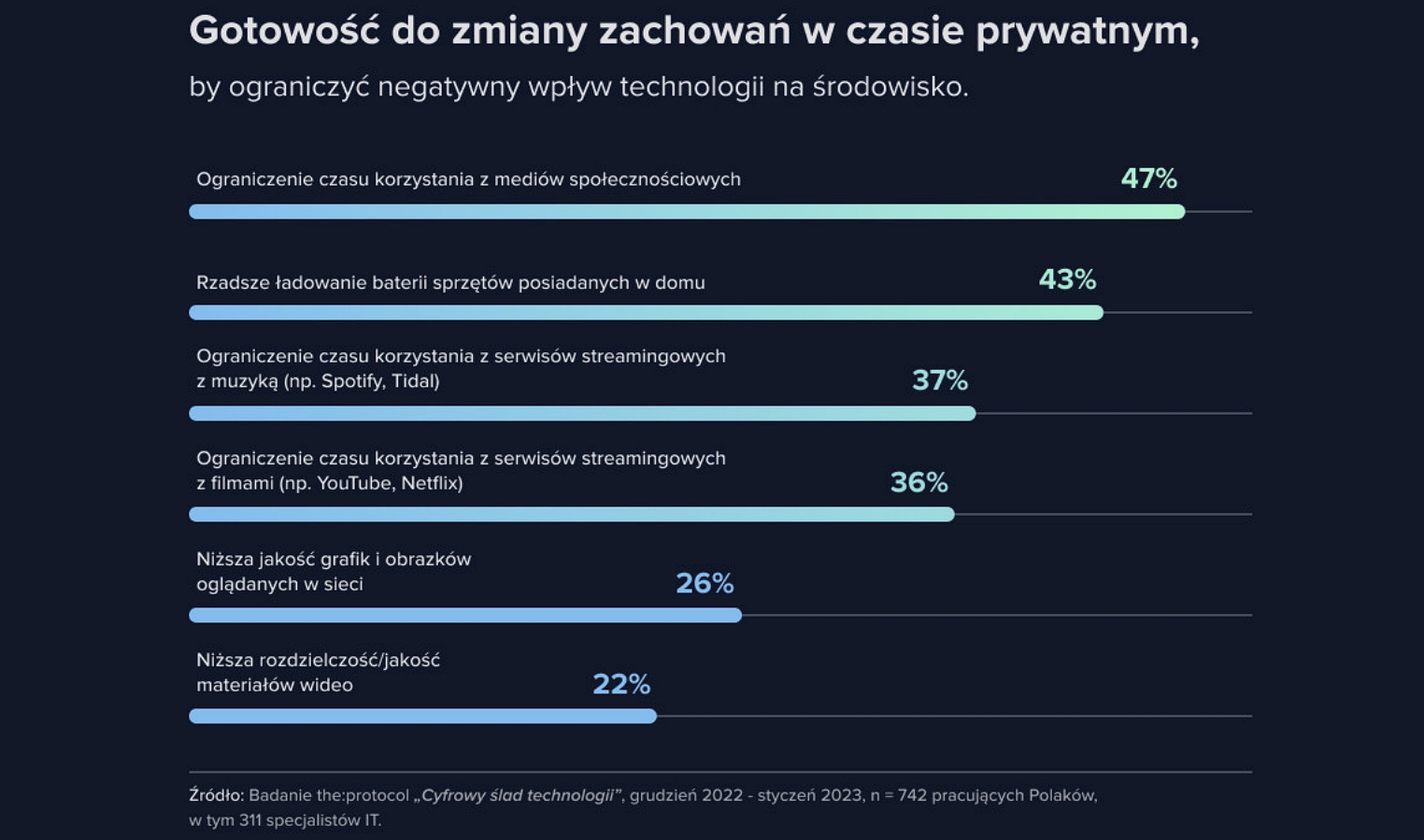 Jak wygląda to w sferze prywatnej? Tutaj według raportu the:protocol najchętniej ograniczylibyśmy media społecznościowe, co podkreśla 47% ankietowanych. W związku z tym idzie kolejna deklaratywna akcja – rzadsze ładowanie baterii i akumulatorów sprzętów posiadanych w domu, na które decyduje się 43%. Co ciekawe, prędzej ograniczymy ilość oglądanego wideo (36% badanych) aniżeli jego jakość (22%). Nieco ponad 1/3 z nas zgodziłaby się na spędzanie mniejszej ilości czasu w serwisach muzycznych.