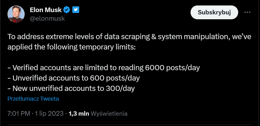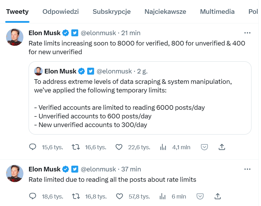 Sytuacja jest przy tym dynamiczna – w czasie od rozpoczęcia pisania tego tekstu do jego opublikowania Elon Musk zdążył zapowiedzieć podniesienie limitów do odpowiednio 8000/800/400 tweetów dziennie. Cóż za łaskawość! Tylko czekać, aż miliarder ugnie się pod naporem opinii publicznej i kompletnie się z limitów wycofa.