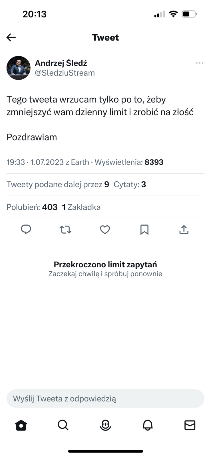 Co ciekawe, przekroczony limit zapytań zdaje się póki co dotyczyć tylko aplikacji mobilnej, bo nadal mogę scrollować do woli Twittera w przeglądarce, ale nie mam wątpliwości, że szybko i ten “błąd” zostanie naprawiony.