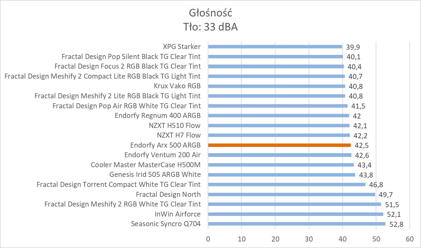 Pod względem głośności nie jest źle. 42,5 dBA nie powinno Wam przeszkadzać, choć są na rynku cichsze obudowy. Cztery 140 mm wentylatory rozkręcone na 100% muszą jednak generować trochę hałasu. Biorąc również pod uwagę naprawdę dobrą wydajność to nie mam do czego się przyczepić.
