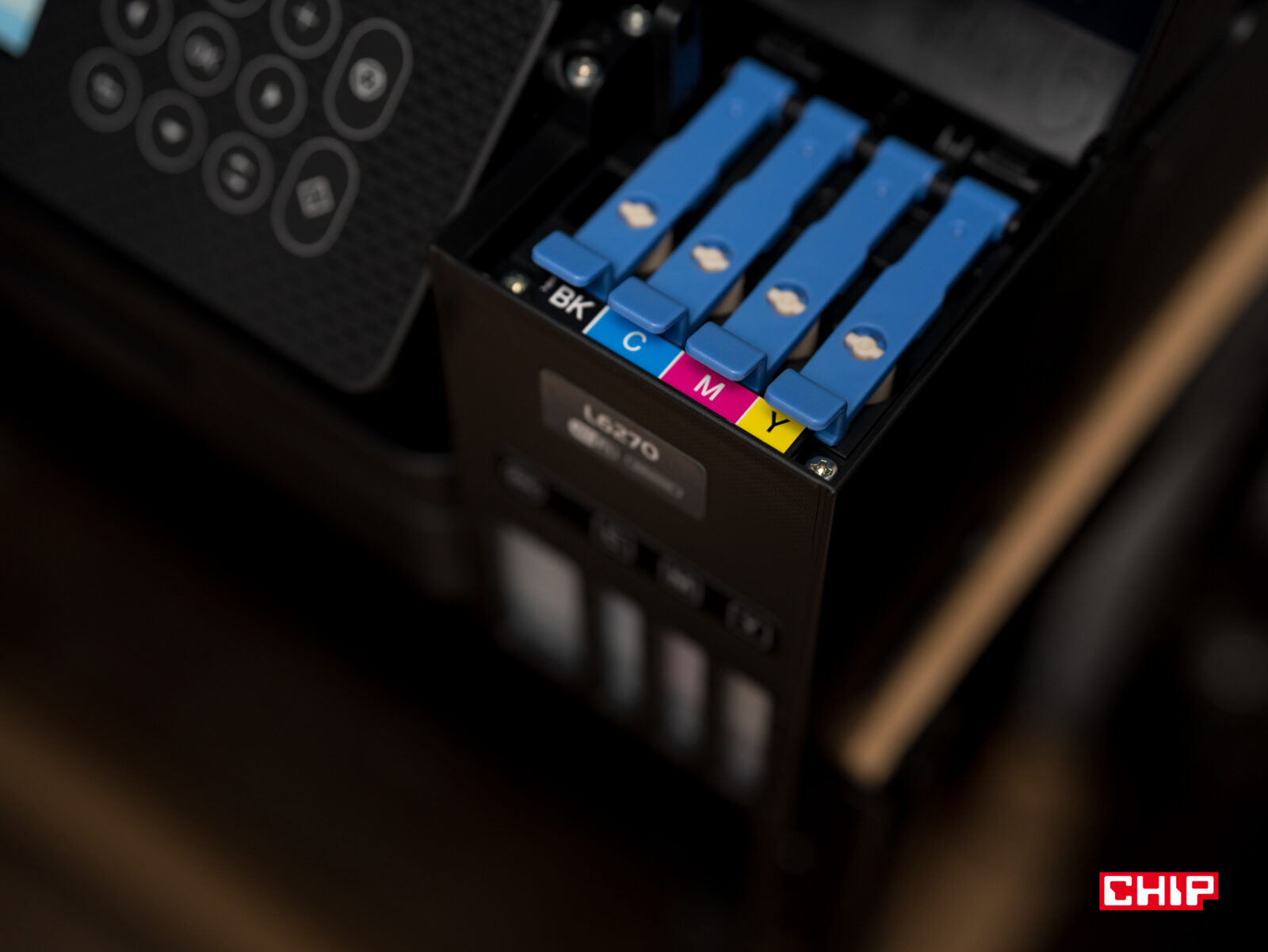 To bodajże największa zaleta rozwiązania EcoTank, dzięki której warto rozważyć jego zakup zamiast drukarki laserowej, a już na pewno zamiast drukarki atramentowej z kartridżami. W takim układzie nie musimy myśleć o eksploatacji; napełniamy zbiorniki z tuszem raz i zapominamy o nich na bardzo długo. Nie musimy też pamiętać o regularnej wymianie, zaś gdy poziom tuszu zrobi się niski, nie dowiadujemy się tego z ostrzeżenia na komputerze (gdy już bywa za późno na wymianę), ale cały czas mamy podgląd poziomu uzupełnienia zbiorniczków dzięki półprzezroczystej obudowie.