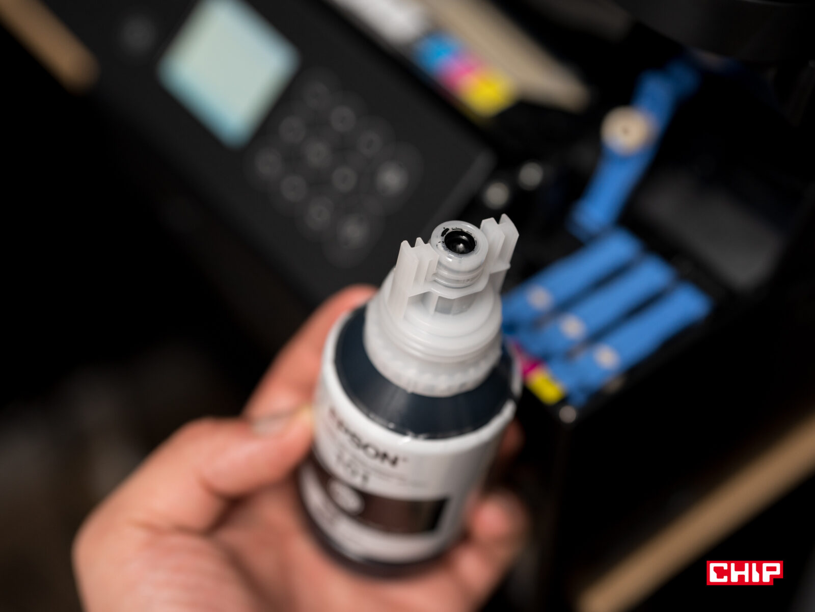 Sam proces uzupełniania tuszu jest też bajecznie prosty. Żadnego brudzenia się z kartridżami czy wyciągania wielkiego tonera; wystarczy unieść obudowę, podnieść zawleczkę, odkręcić zakrętkę i postawić butelkę. Zawór do zalewania skonstruowano tak, by sam utrzymywał pion, więc de facto wystarczy tylko postawić butelkę na pojemniku, a przelewanie dzieje się samo.