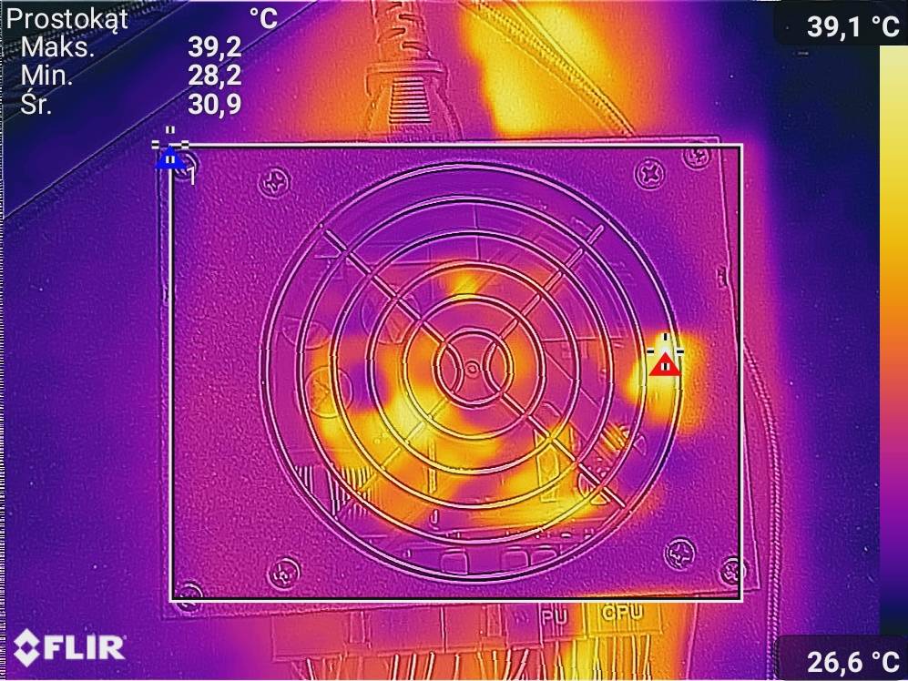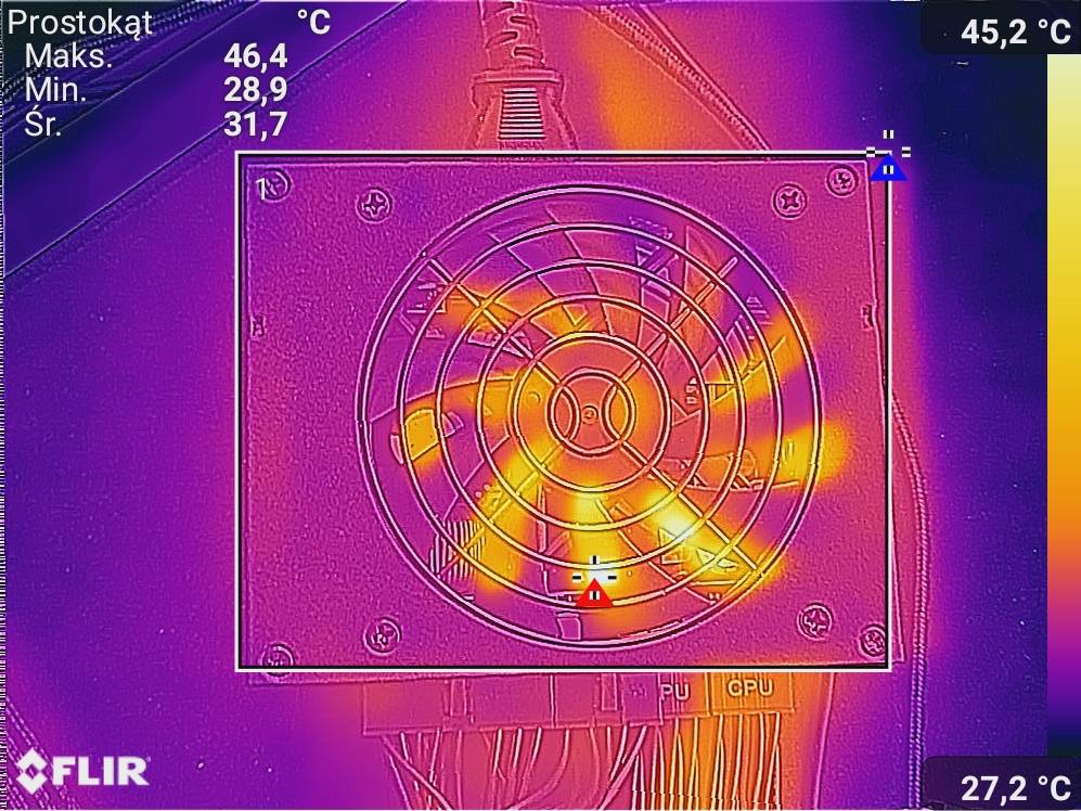 Zasilacz wypadł naprawdę fajnie w testach. Napięcia są dobre i ich zmiana pod obciążeniem jest niska. Pod tym względem nie mam uwag. W spoczynku całość działa pasywnie i dopiero wraz ze wzrostem obciążenia włącza się temperatur. Po dłuższym czasie wentylator robi się słyszalny, ale nie jest bardzo głośny. Spokojnie każde AiO rozkręcone na 100% będzie znacznie bardziej przeszkadzało. Temperatury w spoczynku są wysokie, ale jak zacznie działać wentylator to są one niższe.