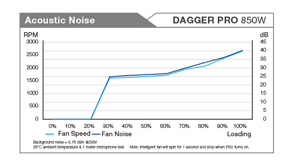 Zasilacz jest chłodzony dzięki 92 mm wentylatorowi PLA09215B12H firmy Power Logic. Pracuje on półpasywnie – przy obciążeniu poniżej 20% nie powinien w ogóle działać. Pełną głośność w zależności od obciążenia najlepiej pokazuje poniższy screen: