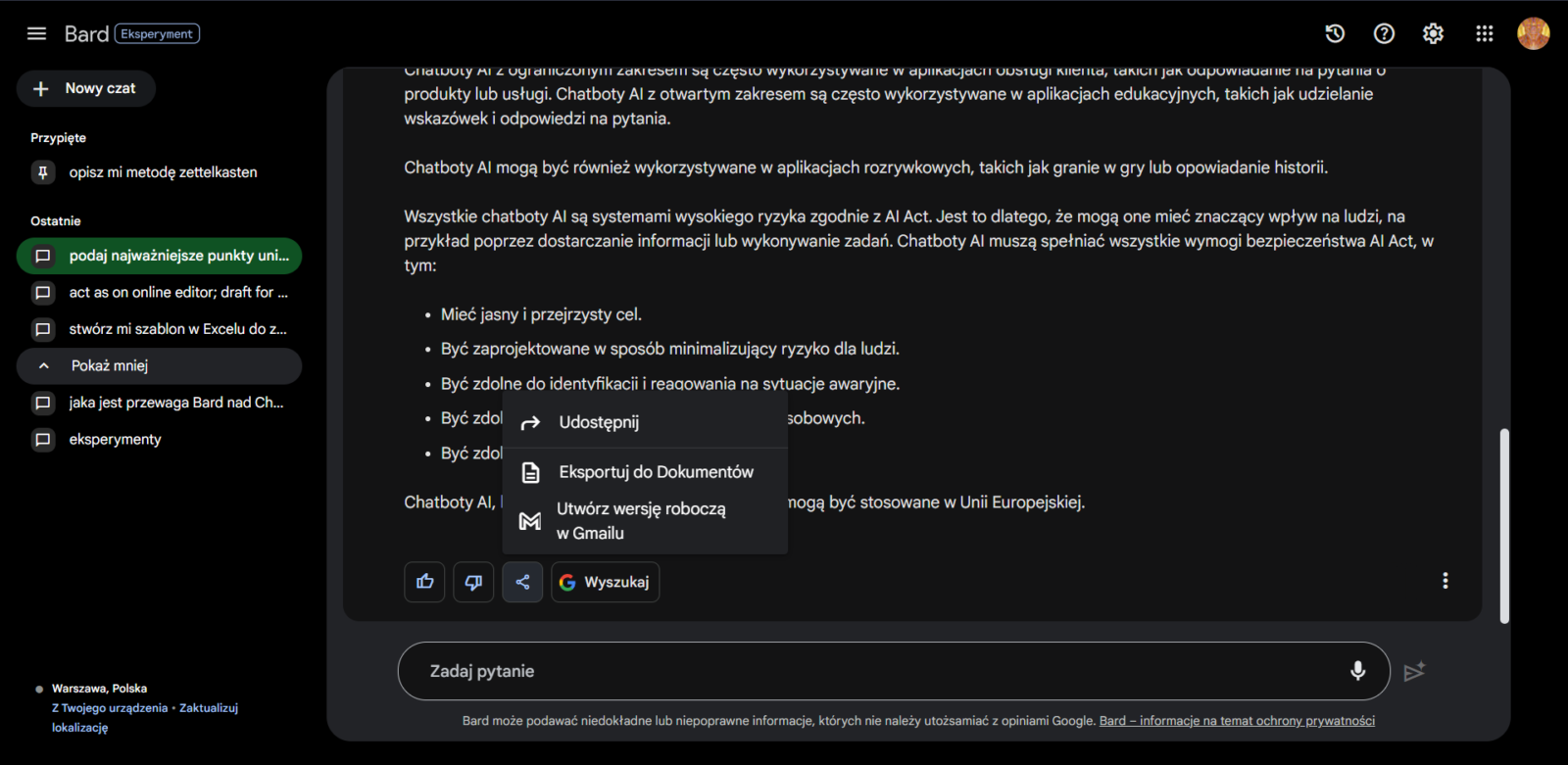 Przewaga ChatGPT nad Bardem zaznacza się póki co na urządzeniach mobilnych. Na razie chatbot Google nie doczekał się samodzielnej aplikacji (ma ją już z kolei ChatGPT dla telefonów z iOS na pokładzie). Obie usługi pozwalają na dzielenie się wygenerowanymi odpowiedziami, jednak Bard może dodatkowo eksportować treść prosto do Dokumentów, tabelę do Arkuszy albo wygenerowany draft wiadomości do Gmaila. Widać tu swoistą przewagę w zakresie ekosystemu Google.