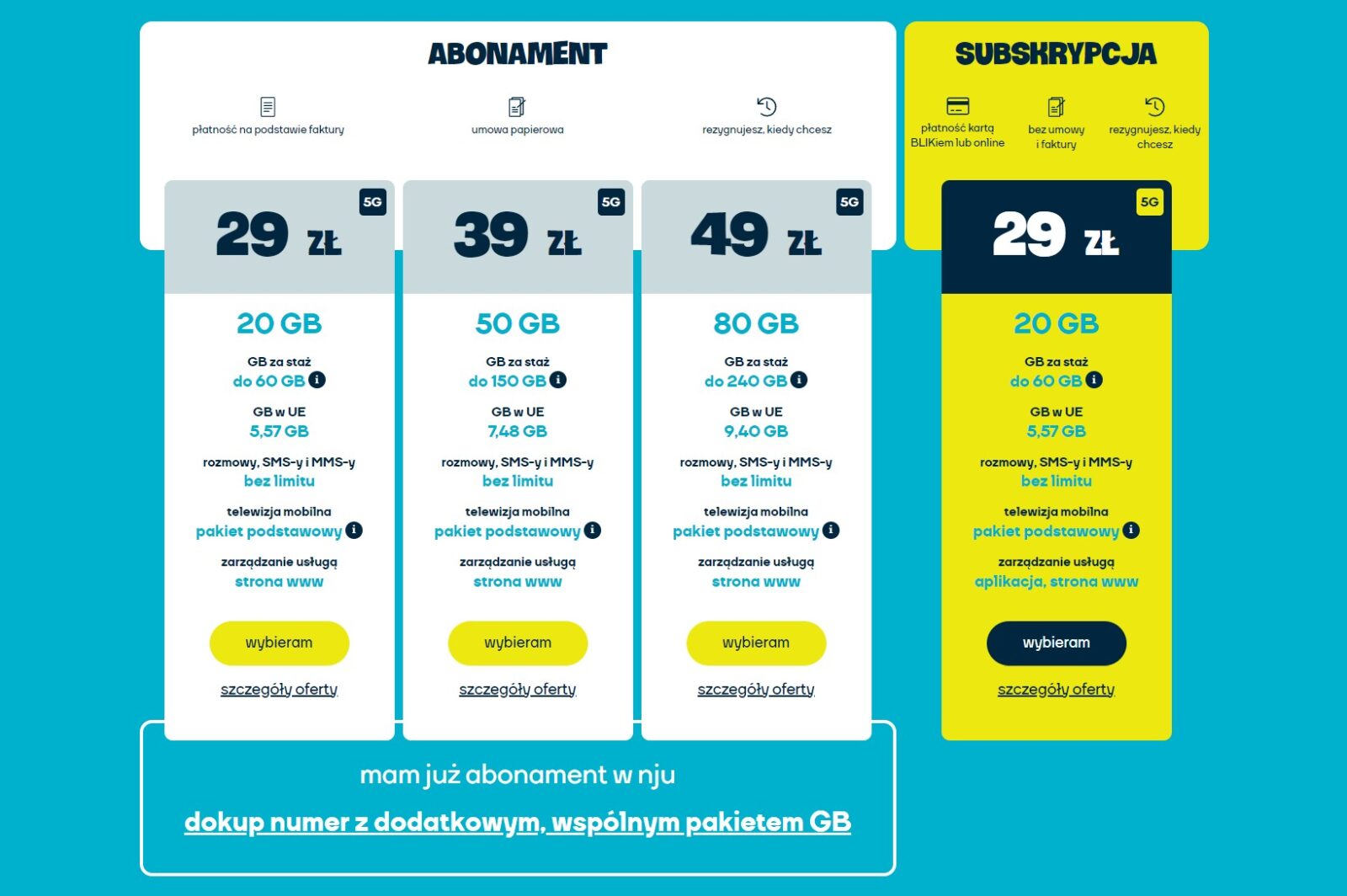 Jeśli to dla was zbyt wysokie koszty lub macie mniejsze potrzeby, zawsze też możecie skorzystać z tańszych opcji. W ofercie 39 zł na start dostaniecie 50 GB, które po dwóch latach urosną do 150 GB, natomiast za 29 zł – odpowiednio 20 GB i 60 GB. Jest też opcja dla najmniej wymagających za 19 zł – bez telewizji, z rozmowami i paczką 3 GB.