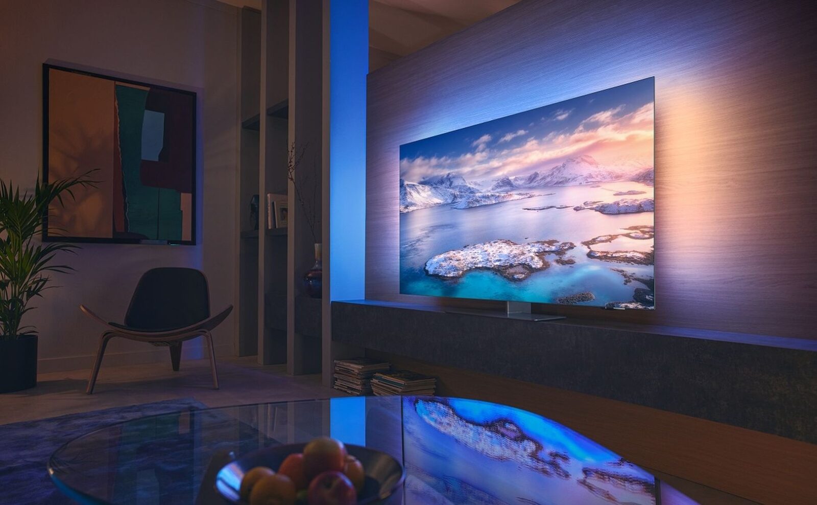 Za jakość obrazu dba nie tylko nowy ekran, ale też procesor obrazu Philips P5 AI 7. generacji z algorytmami sztucznej inteligencji. Są one w stanie w czasie rzeczywistym dostosowywać parametry obrazu, takie jak jasność czy nasycenie kolorów. Pomaga w tym czujnik światła, który bada nie tylko jasność otoczenia, ale też temperaturę barwową. To ciekawa funkcja i teoretycznie telewizor powinien być w stanie dostosować kolory obrazu w zależności od pory dnia oraz typu oświetlenia. Bardzo ciekawi mnie, jak wygląda to w praktyce i mam nadzieję, że już niedługo uda mi się to sprawdzić. Procesor odpowiada też za poprawianie jakości obrazu w ramach funkcji Super Resolution.