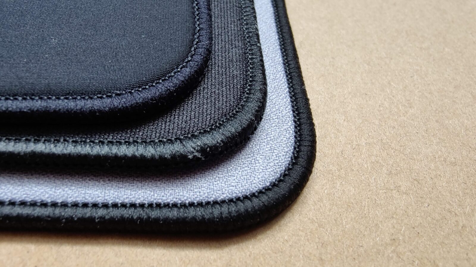Każda ze sprawdzonych przeze mnie podkładek test ten zaliczyła wzorowo, a najgorzej z trójki wypadł model Lamzu Energon, którego gładka gumowa podstawa spisała się gorzej od znacznie bardziej “rozbudowanej” podstawy pozostałego duetu. Każdy producent podszedł do podstawy swojego modelu nieco inaczej, stawiając na fakturę w formie gęstej “choinki”. Cała trójka ma jednak bardzo podobny szew na krawędziach, zabezpieczający gumę i materiał przed strzępieniem się. Szwy są szczególnie gęste, dzierżą dodatkowe przeszycia i mają niski profil, dzięki czemu zarówno nie przeszkadzają aż tak podczas grania (kiedy mysz zbliży się do krawędzi) i zapewniają znacznie wyższą trwałość całości. Nie liczcie jednak na to, że takie obszycia pozostają w idealnym stanie przez dłuższy czas, bo w praktyce wraz z ich użytkowaniem zawsze zaczynają się nieco strzępić.