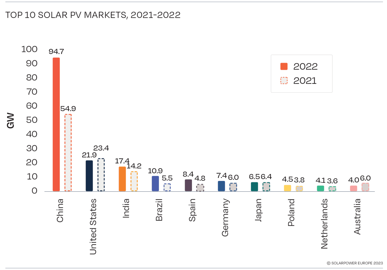 Na czwartym miejscu znajduje się Brazylia z mocą 10,9 GW dla nowych instalacji. Piąta lokata zajmowana jest przez pierwszy europejski kraj – Hiszpanię. Następnie na szóstej pozycji znalazły się Niemcy, na siódmej Japonia i na ósmej… Polska. Rok 2022 był niezwykle łaskawy. W naszym kraju pojawiło się wówczas aż 4,5 GW nowej mocy z fotowoltaicznych źródeł. Jest to wyraźny wzrost względem roku 2021 (3,8 GW nowych instalacji). Czołową dziesiątkę zamykają Holandia i Australia.