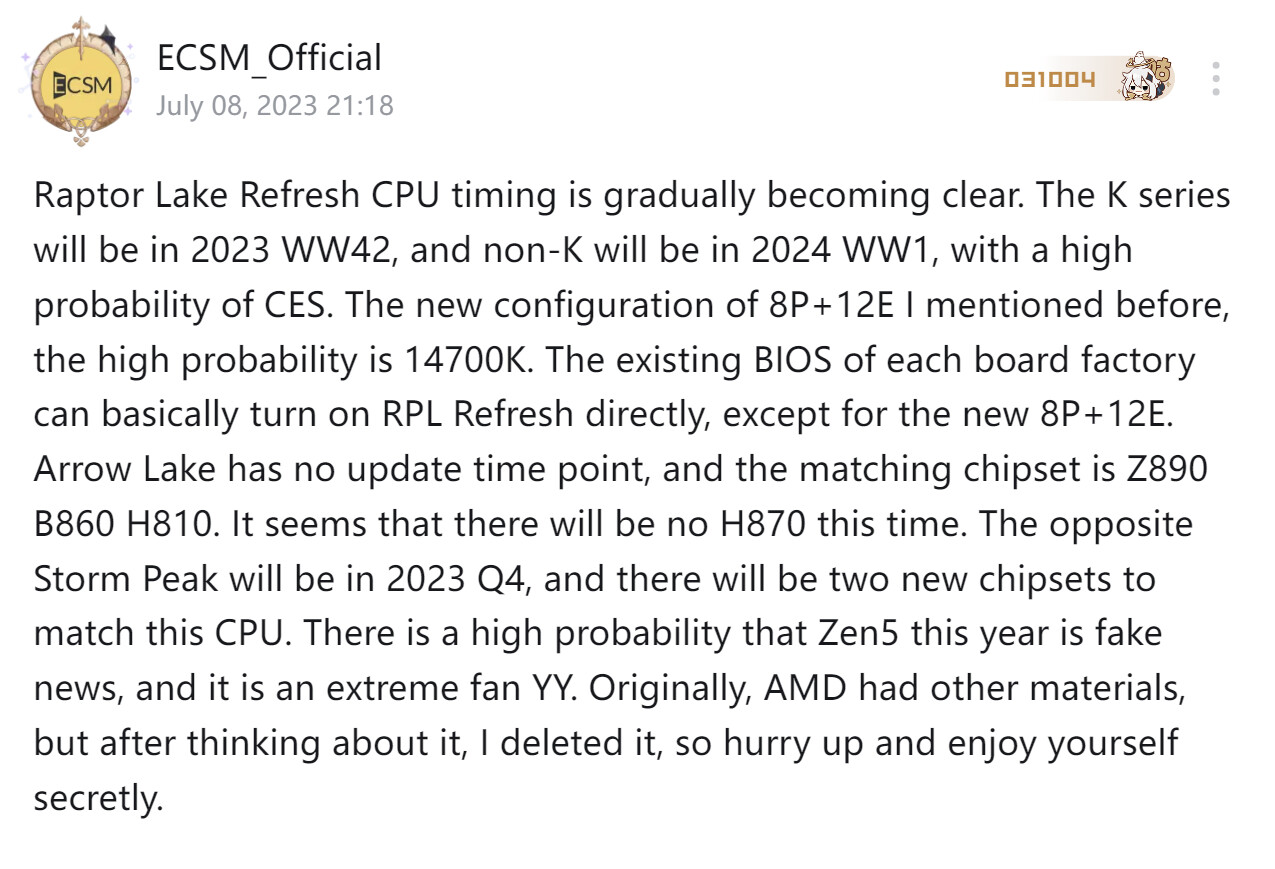 Przechodząc do tego, co najważniejsze, czyli daty premiery procesorów Intel Core 14. generacji na rynku, mam aktualnie dostęp nie tylko do swojego przeczucia, ale też plotek, które wcale nas nie zaskoczyły. Intel ma bowiem planować premierę swoich nowych procesorów Raptor na październik, a dokładniej mówiąc, w czasie od 17 do 23 października. Tradycyjnie na pierwszy rzut pójdą Core 14. generacji z serii -K, czyli tej najwydajniejszej, która dodatkowo umożliwia przeprowadzanie podkręcania, a kilka tygodni później, bo na początku 2024 roku, mamy doczekać się premiery pozostałych układów z zablokowanym mnożnikiem.