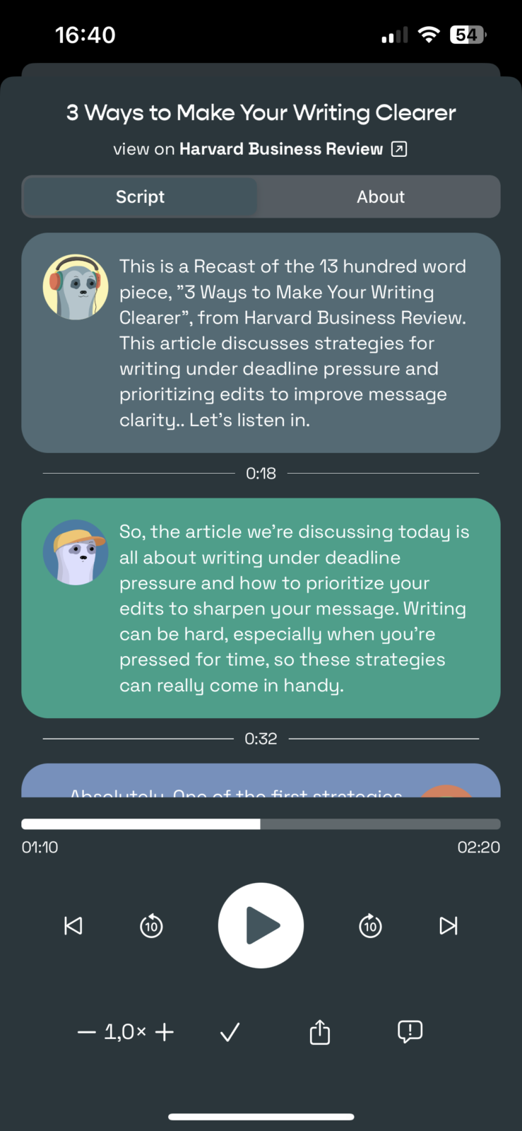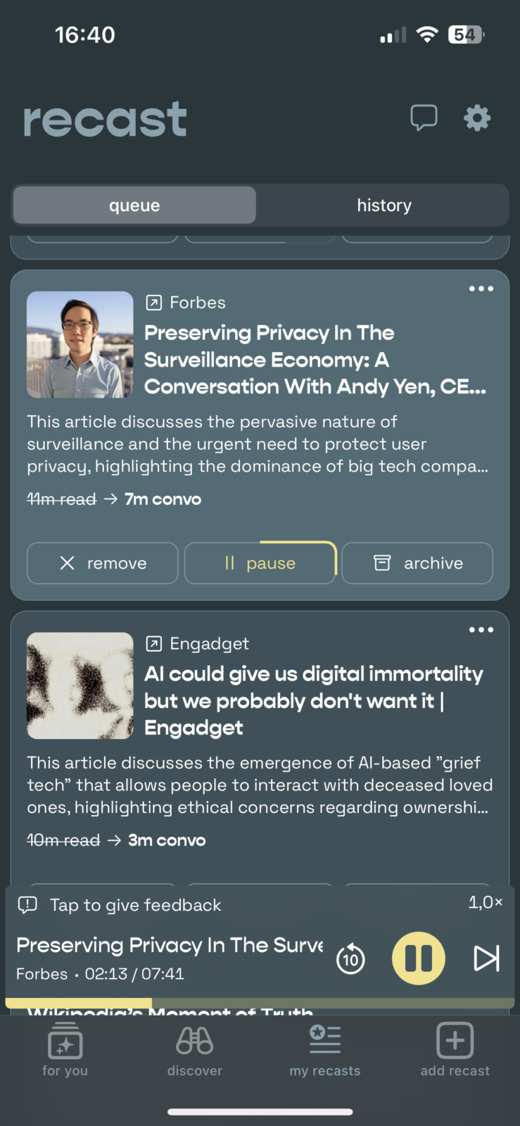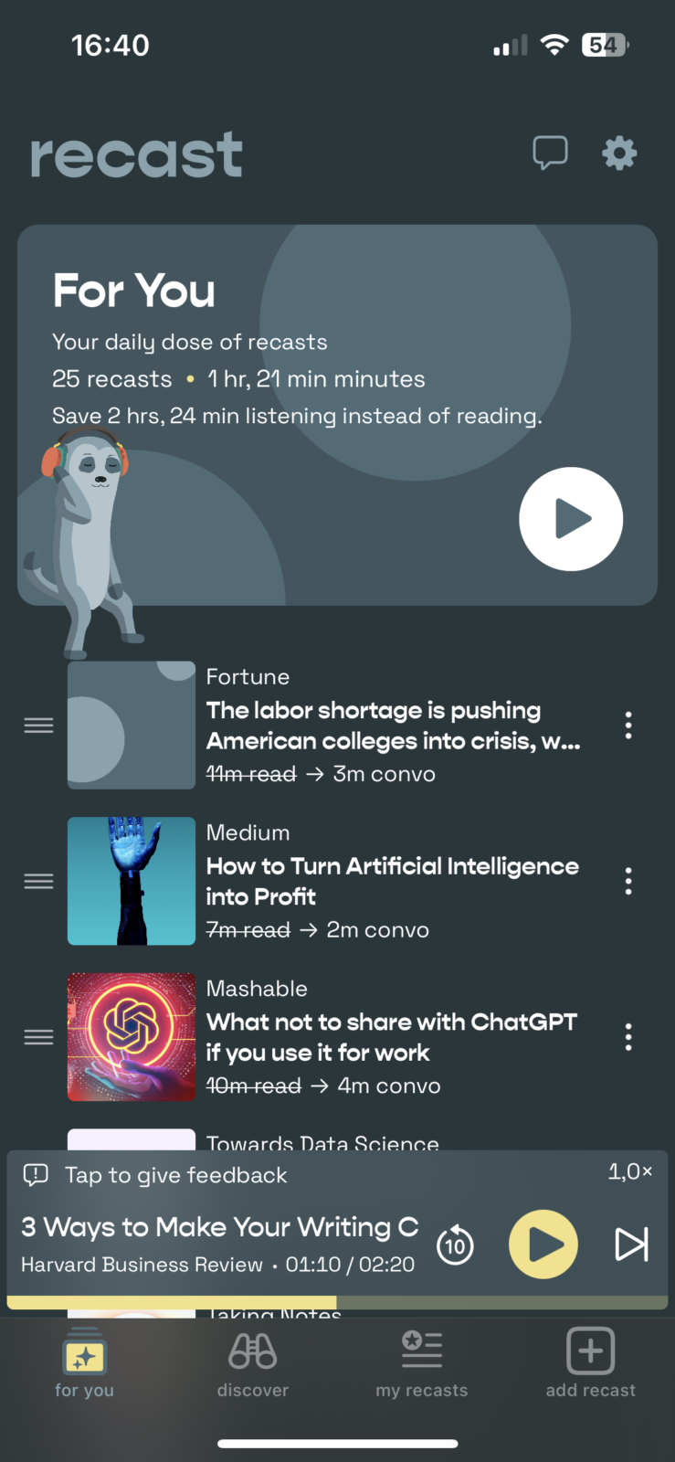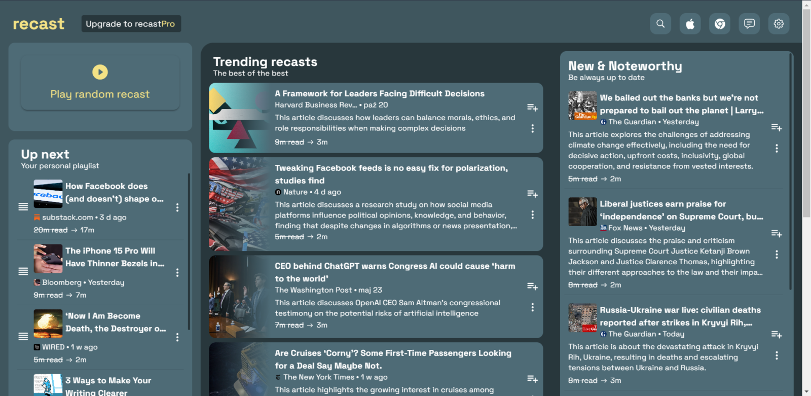 O Recast nie odnotowałem specjalnie dużego hałasu w Sieci. Tymczasem to w pewnym sensie usługa unikalna i z mojego punktu widzenia dość przydatna. Ponieważ doby nie udaje mi się rozciągnąć, a staram się zachować zdrowe 8 godzin snu, doceniam różne sposoby na optymalizację i zachowanie zdrowe balansu. Jednym z nich są dla mnie audiobooki i podcasty. To właśnie bliżej tej drugiej formy wydaje się być bliżej Recast. Aplikacja generuje podsumowania artykułów w formie audio, przypominającej krótką audycję radiową, w której dwóch prowadzących przekazuje w skondensowanej i konwersacyjnej formie najważniejsze informacje. Wspomnianych dwóch prowadzących nie ma jednak formy fizycznej.