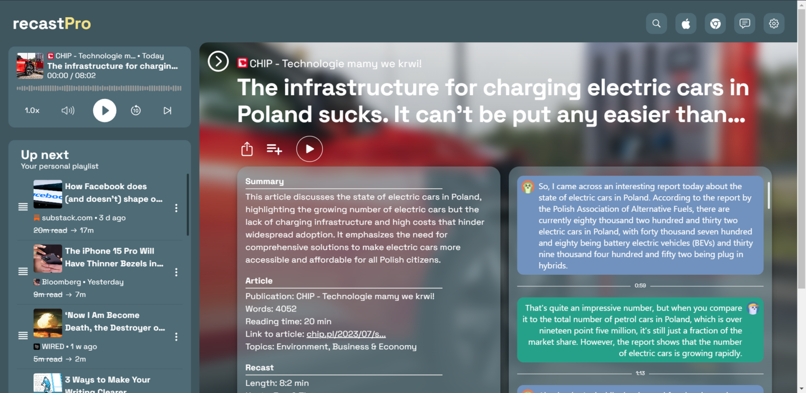 Takiego scenariusza się w zasadzie nie spodziewałem. W ramach eksperymentowania z Recast Pro chciałem sprawdzić, jak poradzi sobie z podsumowaniem tekstu po polsku. Poradził sobie, ale na opak – pozostał przy wersji anglojęzycznej, co dowodzi, że system nie jest obecnie gotowy na generowanie podsumowań w innych językach. Za to doskonale radzi sobie z tłumaczeniem treści na język angielski i generowaniem z niej podsumowania audio. W ten oto prosty sposób mogę podzielić się z angielskojęzyczną Siecią tekstem Łukasza o tym, jak mocno jesteśmy w czterech literach ze stacjami ładowania elektryków w Polsce.