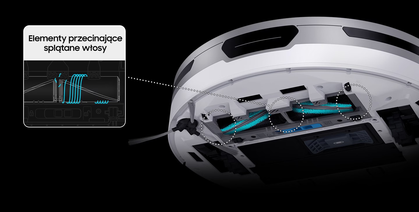 Samsung stawia w swoim odkurzaczu na szczotkę z drobnymi włóknami i gumowymi wstawkami. Co w połączeniu ze zmienną mocą ssania przekłada się na dokładniejsze sprzątanie. Bardzo ciekawą funkcją są dodatkowe elementy wokół szczotek, które przecinają wplątane włosy. Co ciekawe, wbrew pozorom to właśnie włosy zaplątują się w szczotki odkurzacza o wiele mocniej, niż sierść zwierzaków. Podobnie jak wymieniona Roomba i5, Samsung JetBot VR30T80313W mapuje pomieszczenia, pozwala na tworzenie stref bez dostępu oraz sprzątanie w wybranych miejscach. Robotem zarządzamy z poziomu aplikacji SmartThings, która pozwala na integrowanie różnych urządzeń Samsunga.
