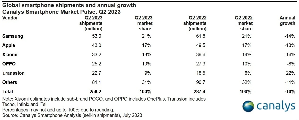 Liderem rynku niezmiennie i bezapelacyjnie jest Samsung, który dostarczył 53 mln smartfonów i należy do niego 21% rynku. Drugi Apple to 42 mln dostarczonych smartfonów i 17% rynku, a podium zamyka Xiaomi – 33,2 mln i 13%. Czwarte miejsce dla Oppo z 25,2 mln egzemplarzy i 10% rynku, a piąte to właśnie Transson – 22,7 mln dostarczonych smartfonów i 9% rynku. Canalys, który dostarcza dane, niestety nie precyzuje, jakie marki i z jakimi wynikami znajdują się w ramach Innych producentów. Dostarczyły one 81,1 mln smartfonów i należy do nich 31% rynku.