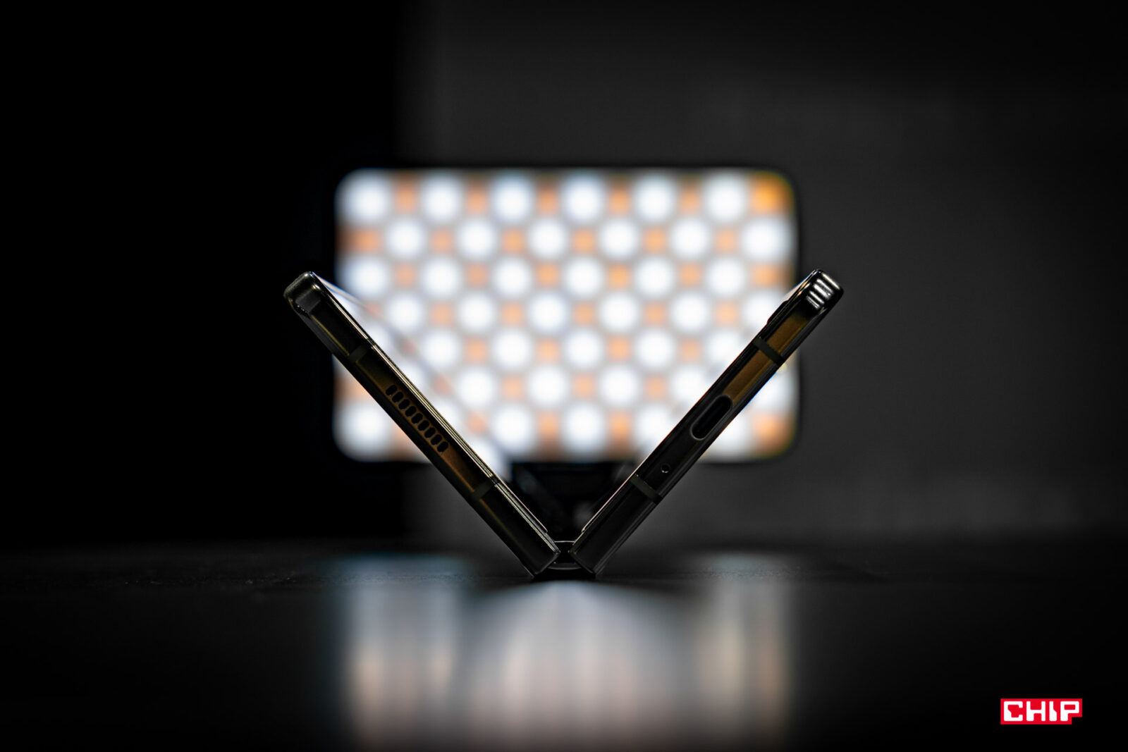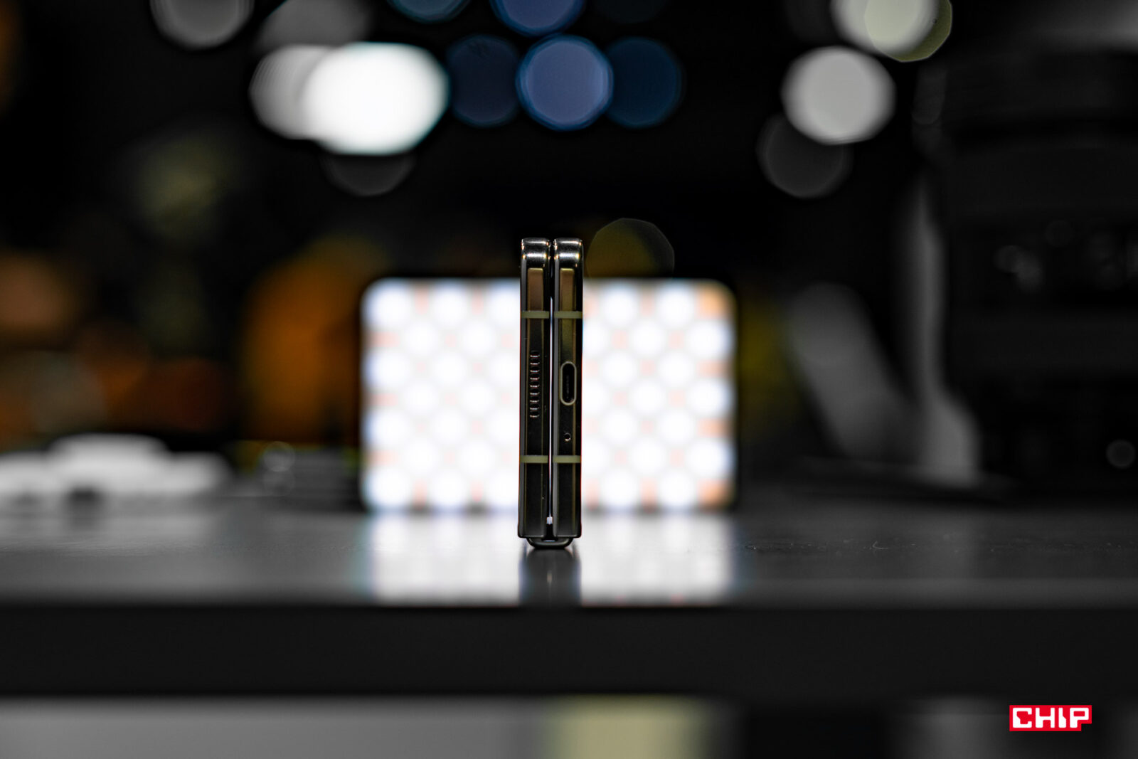 Obudowa złożonego Galaxy Z Flip 5 jest minimalnie szersza – 85,1 vs 84,9 mm, za to cieńsza od poprzednika – 15,1 vs 15,9-17,1 mm. Samsung nie pochwalił się ani masą, ani wymiarami rozłożonej konstrukcji. Cieńsza obudowa to zasługa nowego zawiasu. Obudowa Flipa 5 to zdecydowanie coś innego od reszty rynku i zachowuje się podobnie jak w poprzednich generacjach smartfonu. Klapka otwiera się z wyraźnym oporem, który jest bardzo podobny na całej długości ruchu i można ją zatrzymać pod niemal dowolnym kątem. Co oczywiście ułatwia nagrywanie filmów, czy prowadzenie wideorozmów. Samsung chwali się, że pomiędzy złożonymi połówkami obudowy nie ma już widocznej przerwy. Cóż… nie do końca.