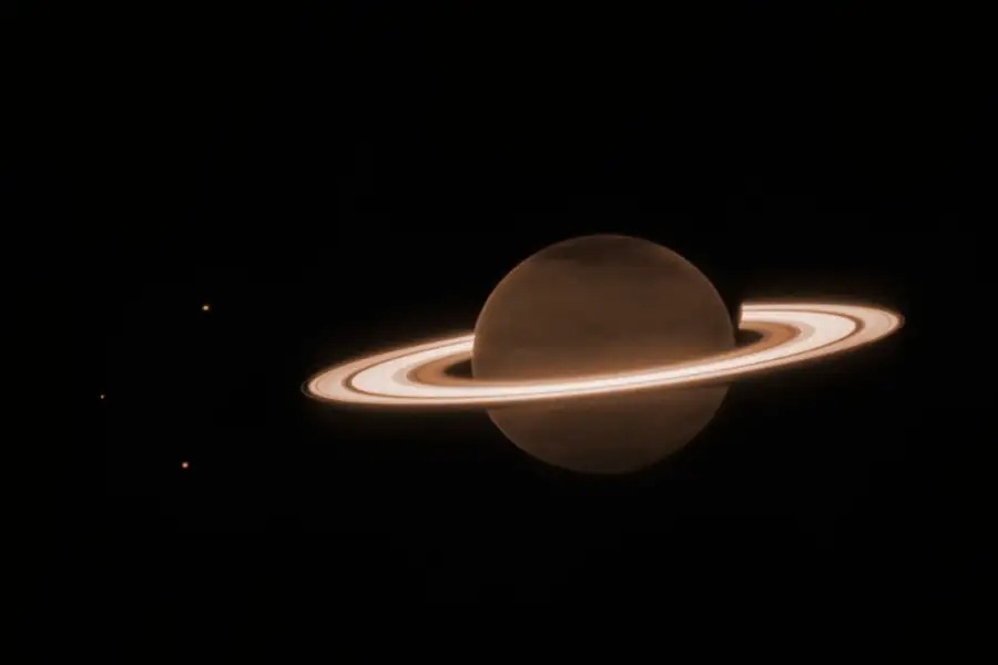 Na zdjęciu wykonanym przez teleskop Webba możemy dostrzec Saturna, jego pierścienie oraz trzy księżyce, zwane kolejno Dione, Tetyda i Enceladus