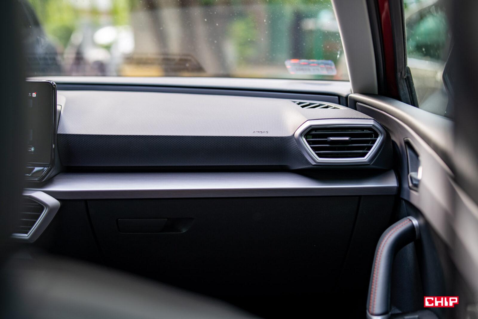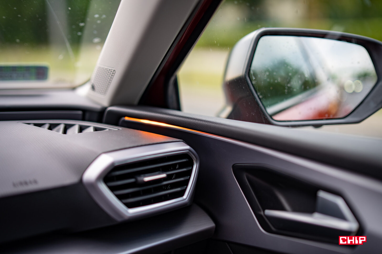 Kolejnym wpływem Volkswagena są czujniki martwego pola. Czytając nasze testy wiecie, że bardzo zwracamy uwagę na ten element. Seat Leon Sportstourer jest w nie wyposażony, ale ich działanie wymaga bardzo dużego przyzwyczajenia. Sygnalizator czujników nie znajduje się jak zazwyczaj na szybie lusterka, ani też na jego obudowie jak w niektórych Volkswagenach, a… na listwie świetlnej na drzwiach. Leon ma dwie strefy podświetlenia. Jedna poniżej deski rozdzielczej, a druga to właśnie taki pasek biegnący pod całą przednią szybą i do połowy drzwi, w ich górnej części. Obie strefy możemy podświetlić na inny kolor. Czujnik martwego pola sygnalizuje niebezpieczeństwo podświetlając połowę paska na drzwiach na pomarańczowo. Tak wygląda to przy podświetleniu wygaszonym (w dzień) oraz kiedy jest aktywne i świeci się na inny kolor: