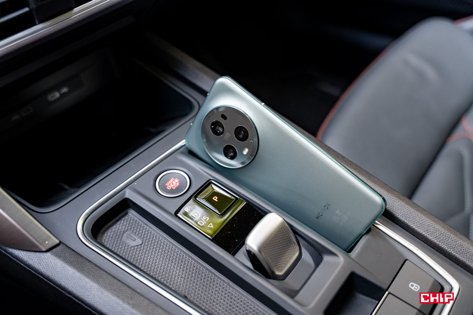 Obok selektora zmiany kierunku jazdy mamy dwa zagłębienia. Lewe jest płytsze, więc telefonu tam nie włożymy, za to prawe jest głębsze, ale… telefon tam nie włożymy. Chyba że to mniejszy model z ekranem znacznie mniejszym niż 6,5 cala. 6,8 cala wygląda tutaj tak: