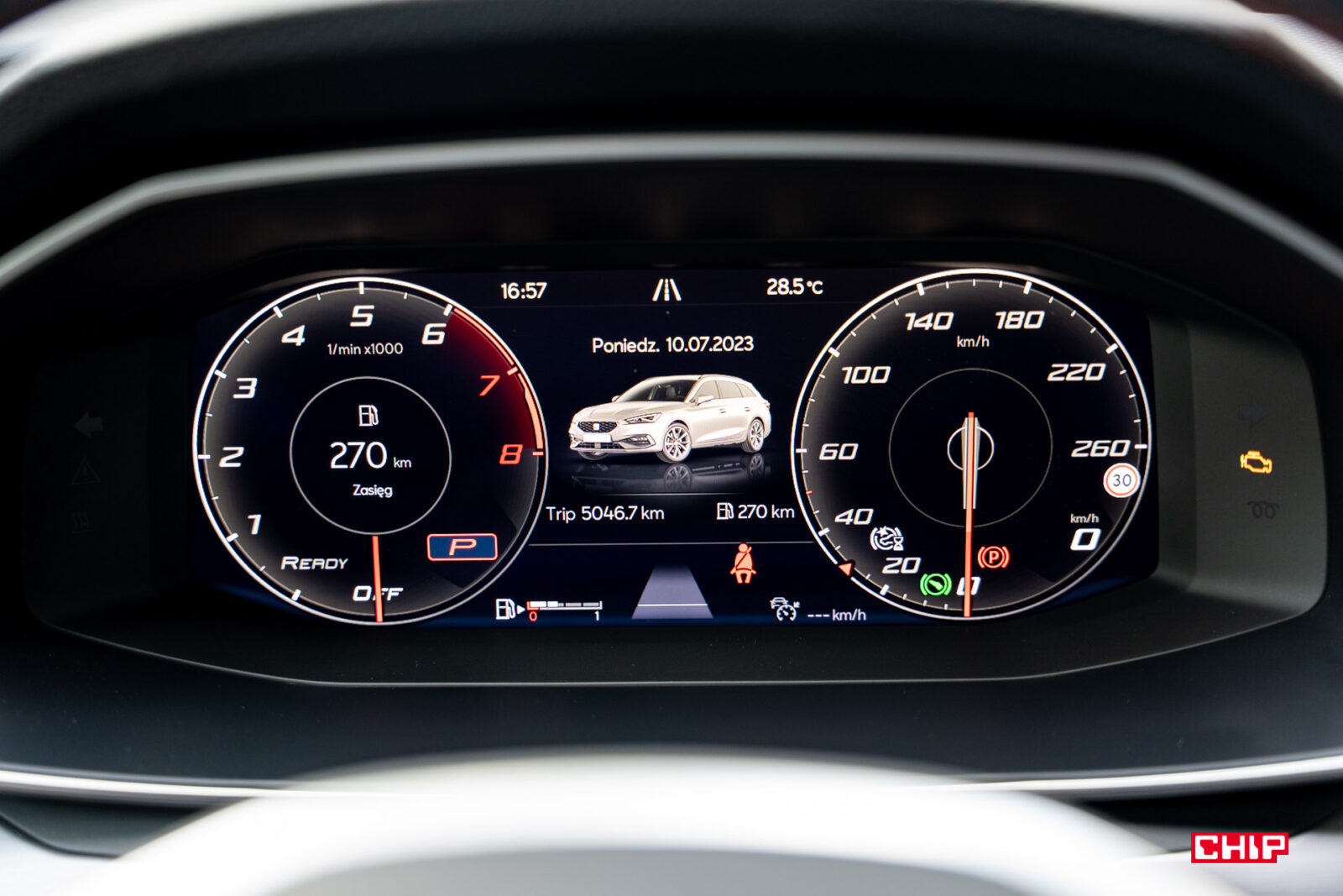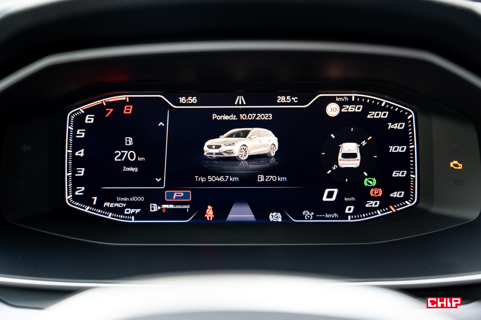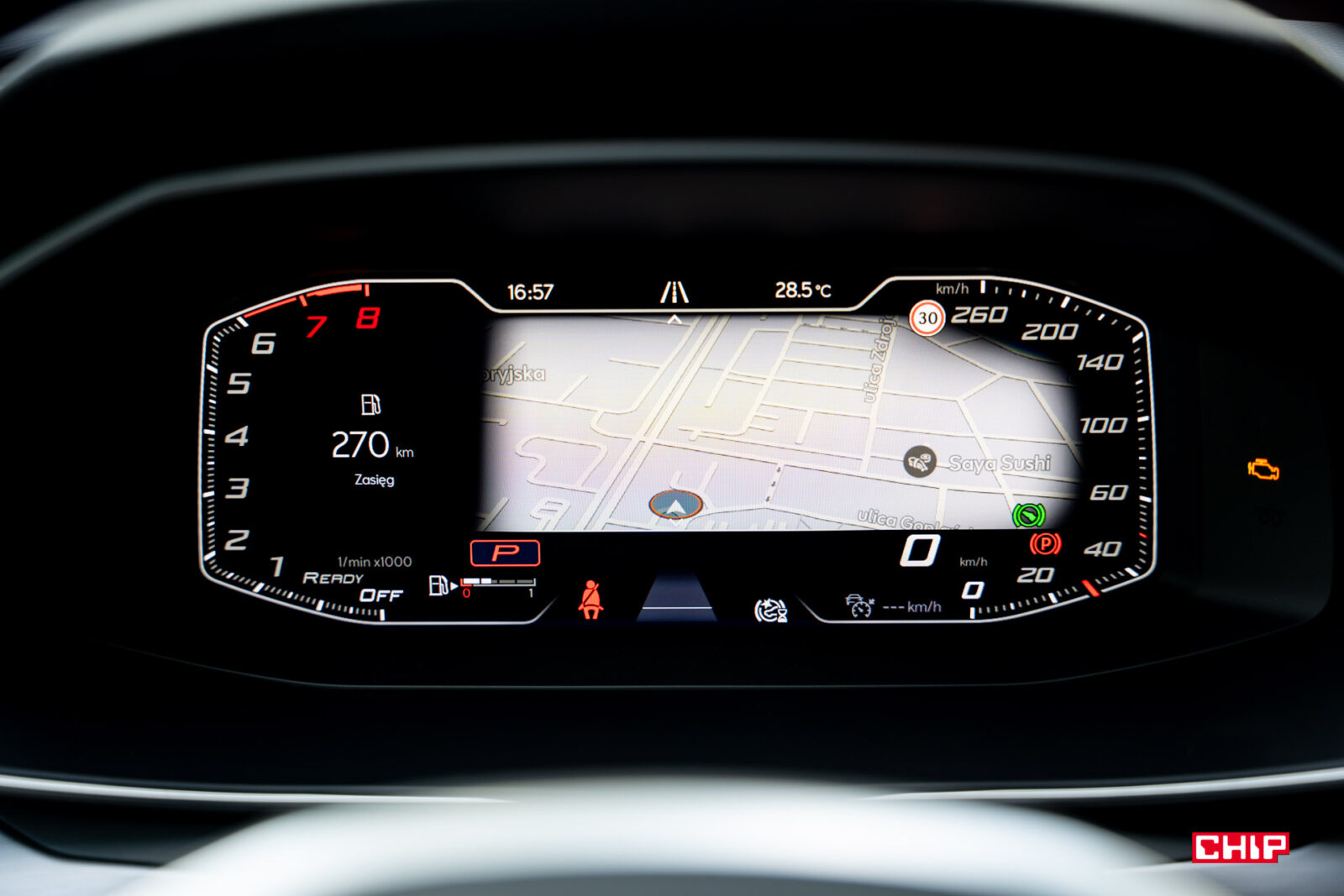 Zazwyczaj staramy się unikać wrzucania nieskończenie wielu zdjęć interfejsu, ale w przypadku Leona zrobimy wyjątek. Ekran kierowcy może być skonfigurowany na masę różnych sposobów. Można tu zrobić dosłownie choinkę przeróżnych wyświetlanych informacji, można dowolnie łączyć ze sobą elementy, wybrać widok nieco bardziej analogowy, całkowicie cyfrowy, a na deser dołożyć do tego mapę. Zobaczcie sami: