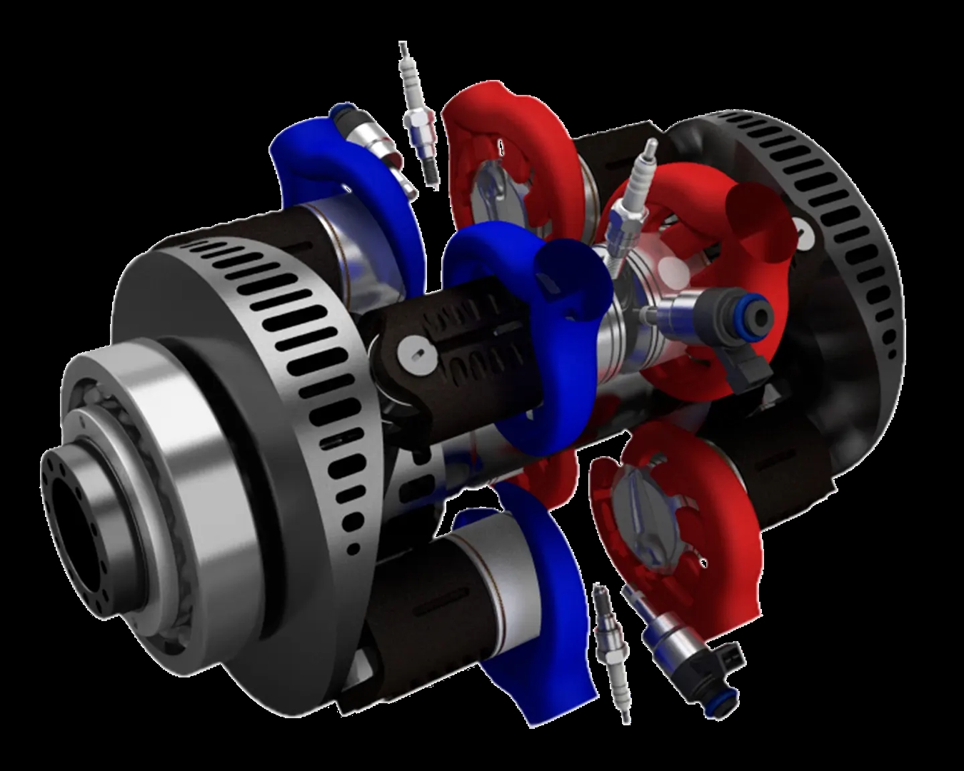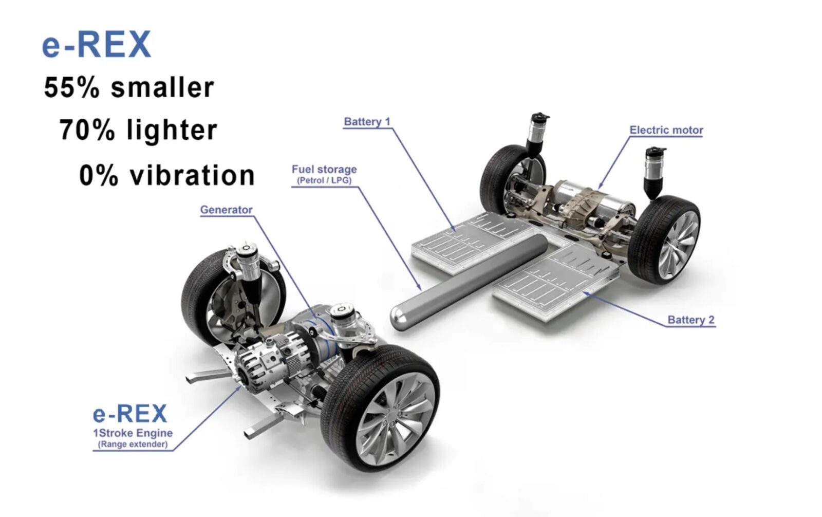 Tutaj do gry wchodzi na wskroś wyjątkowy silnik spalinowy e-Rex firmy INNengine, który działa w unikalny sposób, a to dzięki swojej innowacyjnej budowie. Jest to teoretycznie jednosuwowy silnik, ale tylko z pozoru, bo w procesie spalania biorą udział łącznie dwa ruchy (suwy). Szaleństwa do tej mieszanki dodaje fakt, że silnik ten nie spala oleju ani nawet nie wykorzystuje jednego z tych suwów do smarowania lub chłodzenia. Ten proces odbywa się oddzielnie, czyli dokładnie tak, jak w konwencjonalnym czterosuwowym silniku samochodowym.
