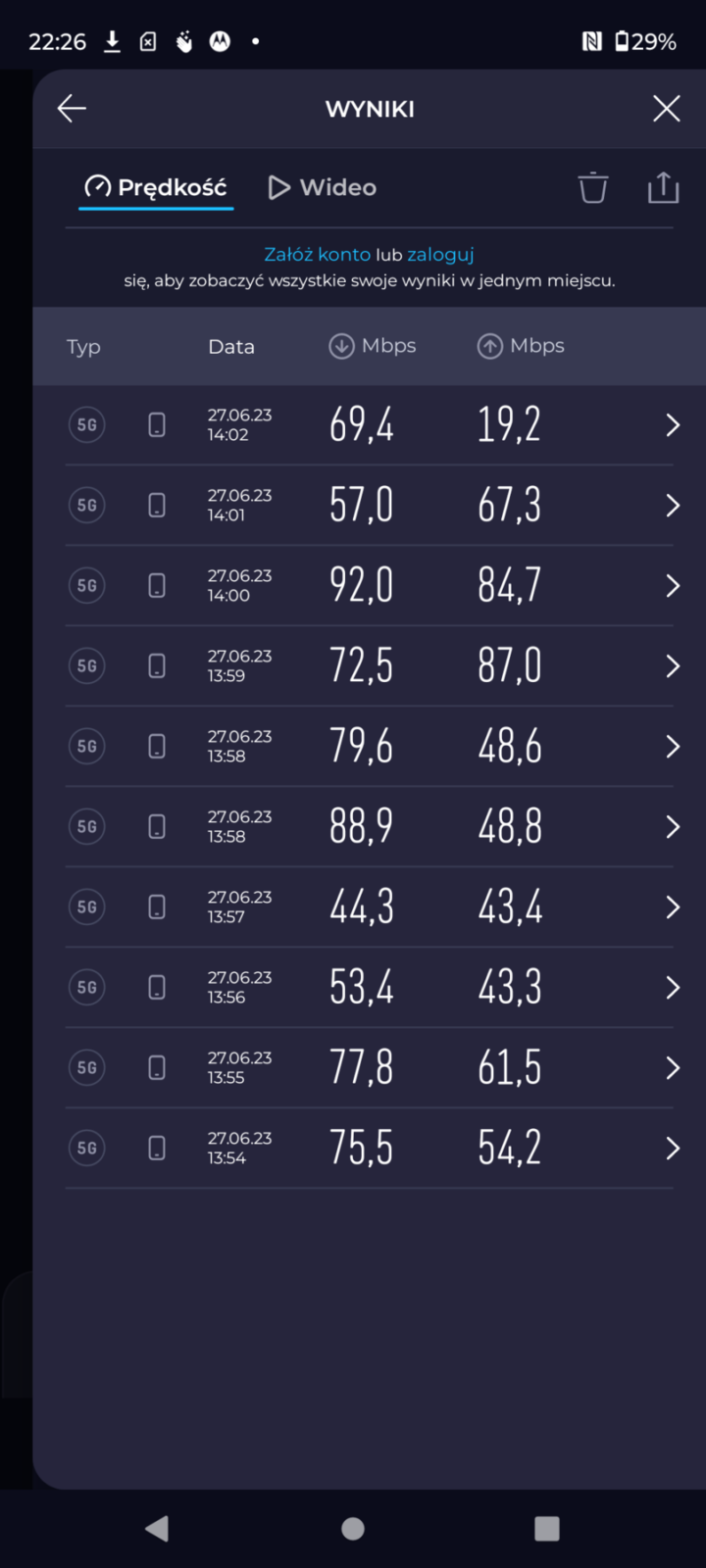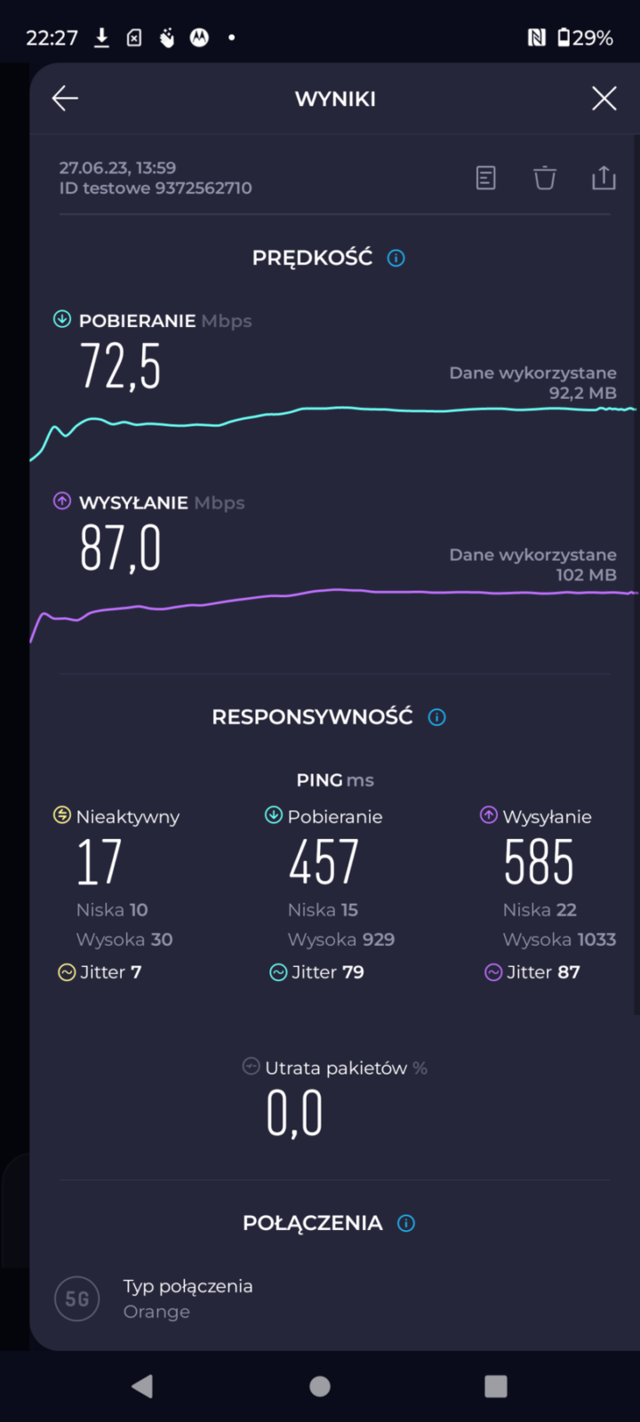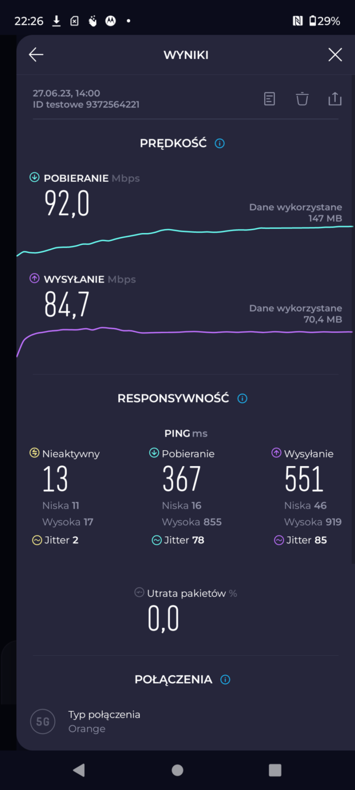 Motorola Edge 40 jest Dual-SIMem, ale slot na fizyczne karty nanoSIM jest tylko jeden, a drugi numer telefonu możemy podpiąć dzięki usłudze eSIM. Szkoda, bo miejsce na drugą kartę nanoSIM by się znalazło. Nie ma również slotu na karty pamięci, o czym wspominałem już wcześniej. Dostajemy za to obsługę sieci 5G, choć osiągane prędkości mogłyby być lepsze – w 10 próbach w programie Speedtest, uzyskałem maksymalnie 92 Mb/s (pobieranie) i 87 Mb/s (wysyłanie danych). Wynik uzyskany praktycznie w samym centrum Warszawy (w sieci Orange), także powinno być trochę lepiej w przypadku pobierania danych. W domu (i nie tylko) możemy skorzystać również z Wi-Fi 6 – przez cały okres testów działało bez zarzutu.