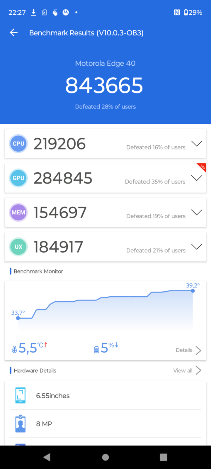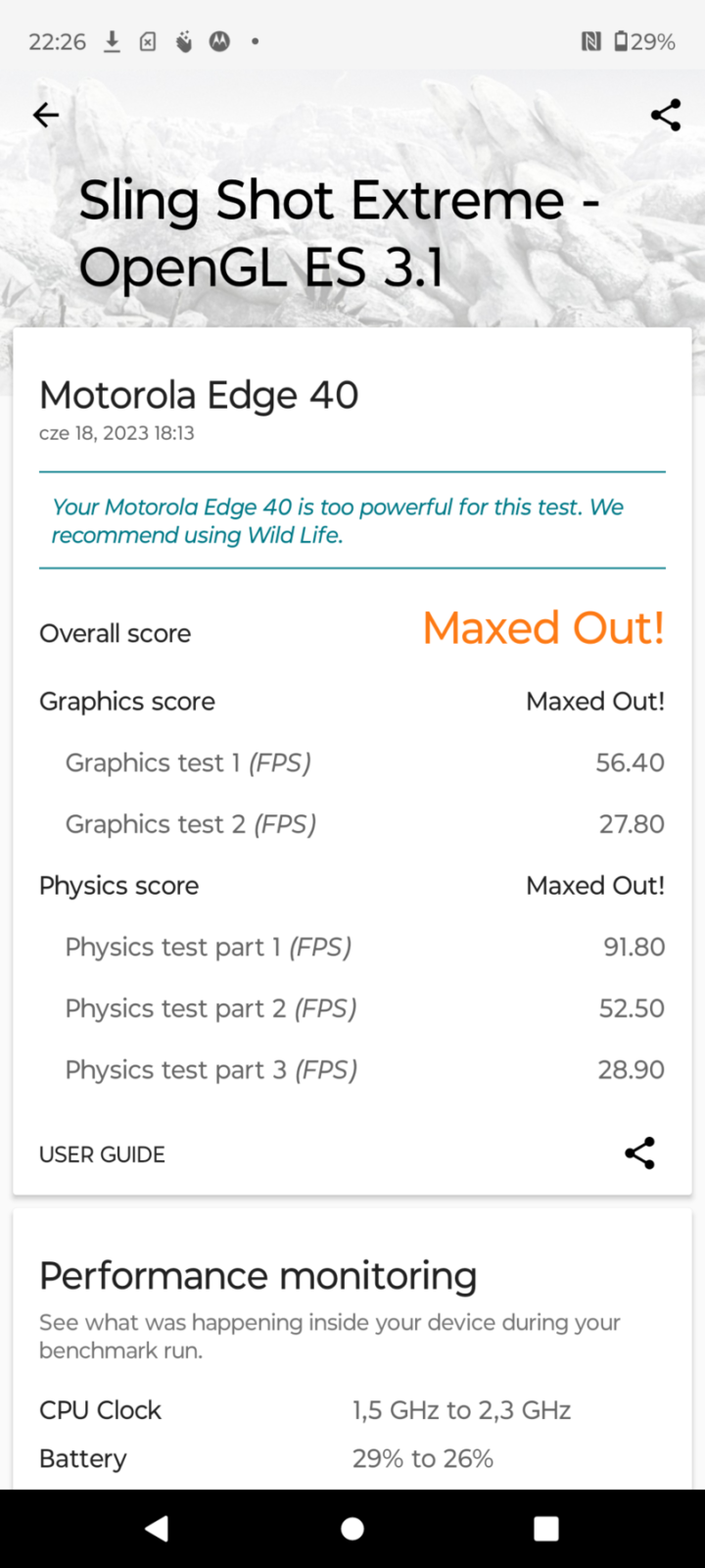 Jak widać w testach syntetycznych smartfon wypada naprawdę nieźle – wyraźnie lepiej od oferowanego w podobnej cenie Infinixie Zero Ultra. W codziennym użytkowaniu Motorola Edge 40 działa bardzo płynnie i stabilnie – nie zauważyłem żadnych problemów. Co więcej, nawet podczas długich sesji z wymagającymi grami, wydajność praktycznie nie spada, co pokazują wyniki w stress testach na poziomie aż 98,9%. Jest to dość zaskakujące, patrząc na… nagrzewanie się obudowy.