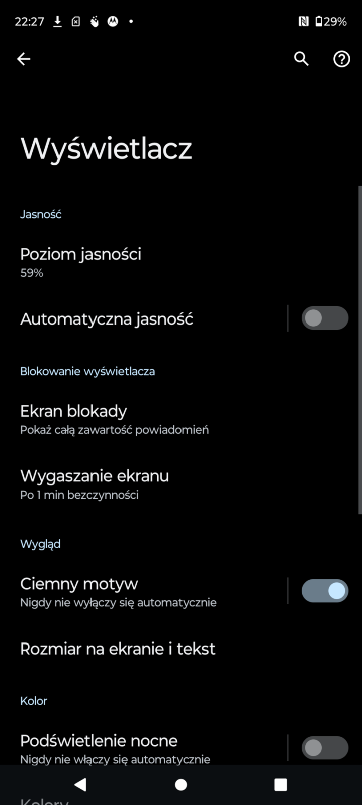 W ustawieniach znajdziemy oczywiście tryb ciemny dla menu, filtr światła niebieskiego, opcję zapobiegającą migotaniu obrazu w ciemnym otoczeniu oraz możliwość regulacji częstotliwości odświeżania oraz temperatury barwowej.
