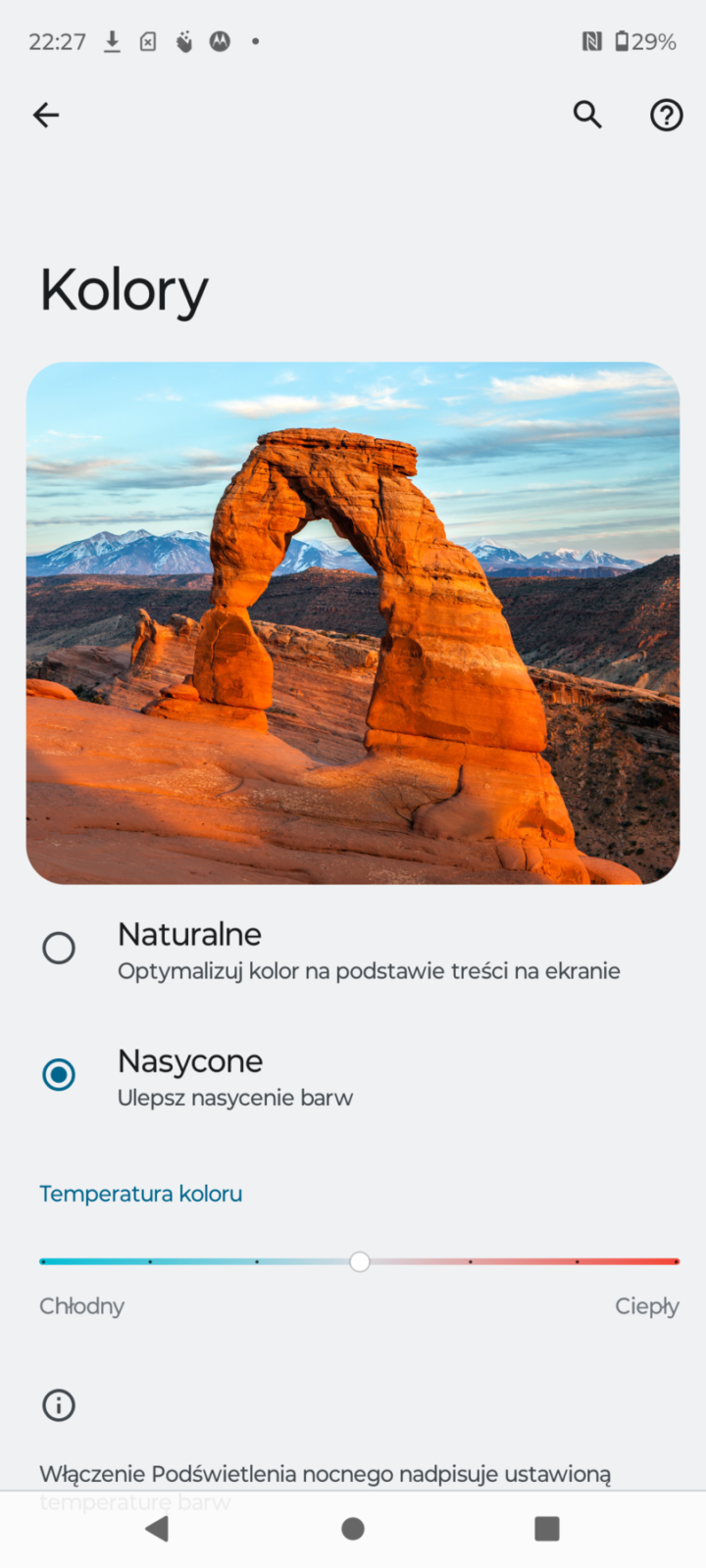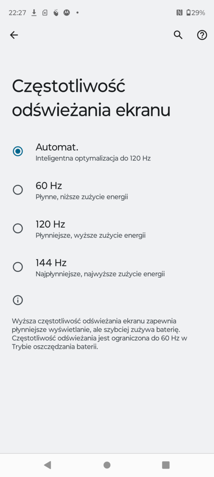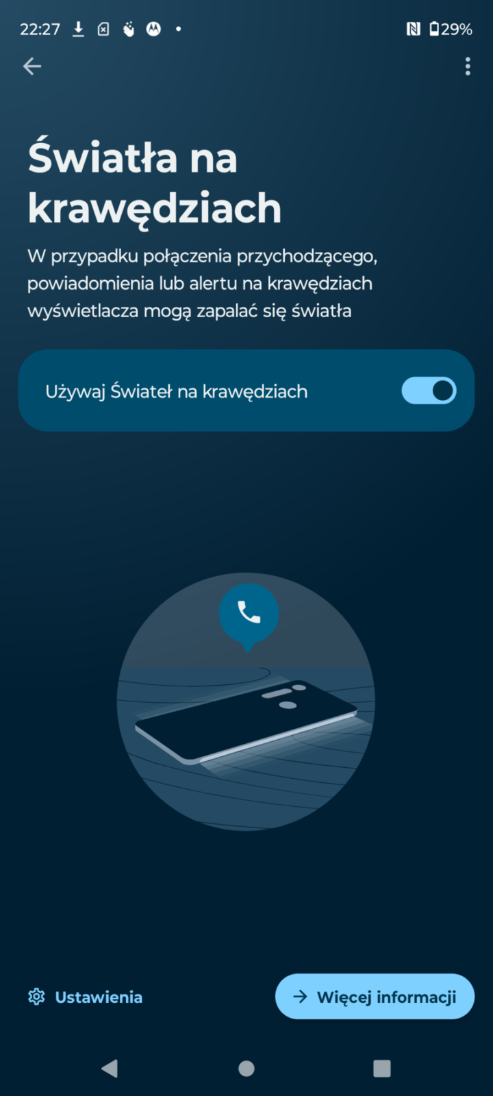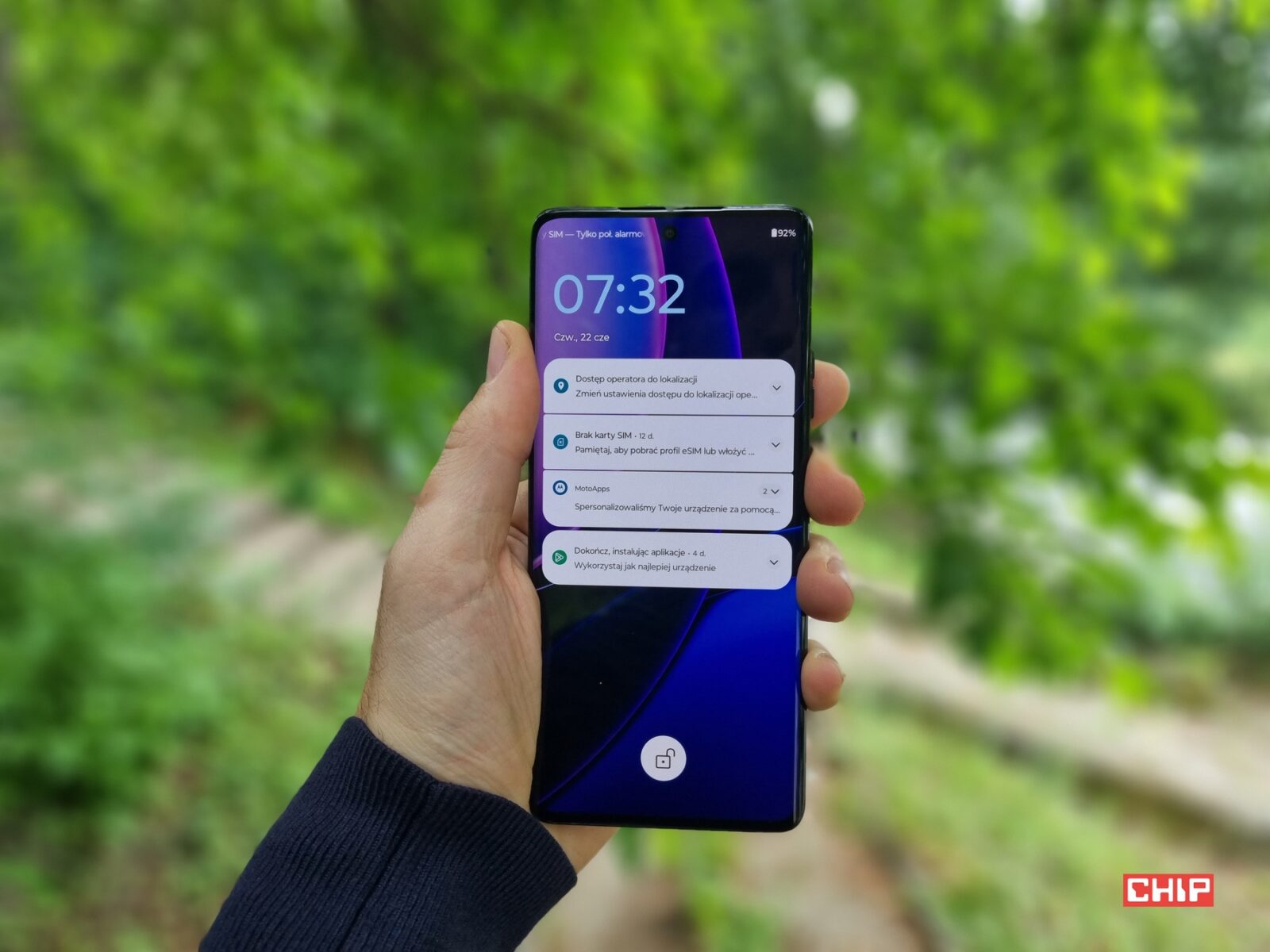 Telefon działa pod kontrolą Androida 13, co oczywiście nie jest żadnym zaskoczeniem. Wizualnie jest to praktycznie czysty system, z dodanymi kilkoma aplikacjami i funkcjami od producenta. Działa on bardzo płynnie (szczególnie gdy ustawimy częstotliwość pracy wyświetlacza na 120 lub 144 Hz) i stabilnie. Z aplikacji wgranych przez producenta należy wymienić program „Moto Secure”, służący m.in. do zabezpieczenia wybranych folderów, dostępu do ekranu i sieci oraz „Moto”, w którym skonfigurujemy m.in. wygląd czcionek i ikon oraz dostosujemy sterowanie gestami.