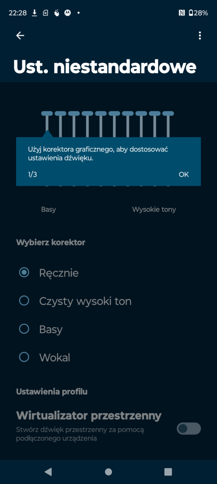 Motorola Edge 40 ma oczywiście na pokładzie głośniki stereo, ale jeden z nich jest wykorzystywany do prowadzenia rozmów telefonicznych. Skutek? Gra on ciszej niż dedykowany głośnik zewnętrzny umieszczony na ramce po drugiej stronie, w związku z czym stereofonia jest lekko zaburzona. Niemniej na co dzień to nie przeszkadza, w przeciwieństwie do płaskiego, lekko zniekształconego dźwięku odtwarzanego na najwyższych poziomach głośności. Jeśli jednak nie przekraczamy tak, powiedzmy ¾ skali, to dźwięk jest okej. Zwłaszcza po włączeniu systemu Dolby Atmos, który domyślnie jest nieaktywny.