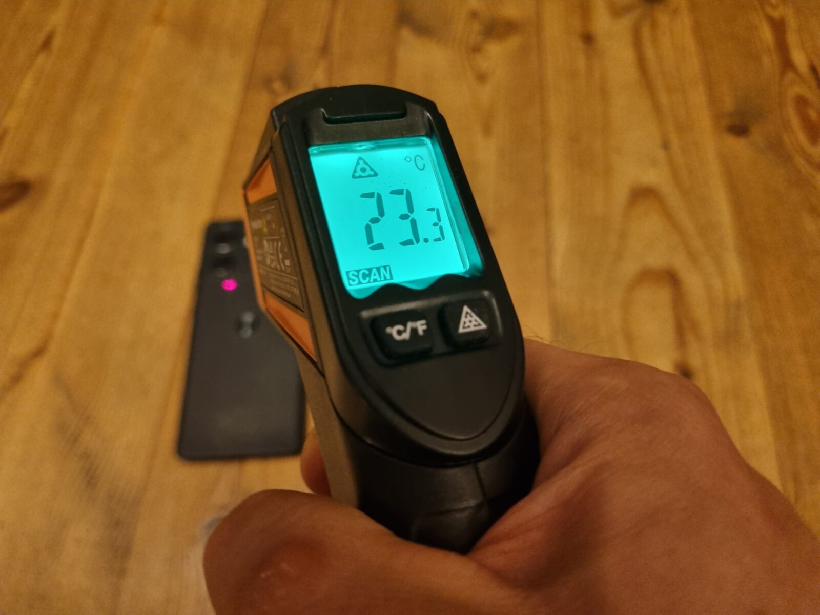 Temperaturę obudowy zmierzyłem pirometrem w domu, w temperaturze powietrza równej 23 C. Smartfon nie był wystawiony na promienie słoneczne. Temperatura początkowa wyniosła 23,3 C. Po włączeniu zapętlonego benchmarka, temperatura rosła w następujący sposób: