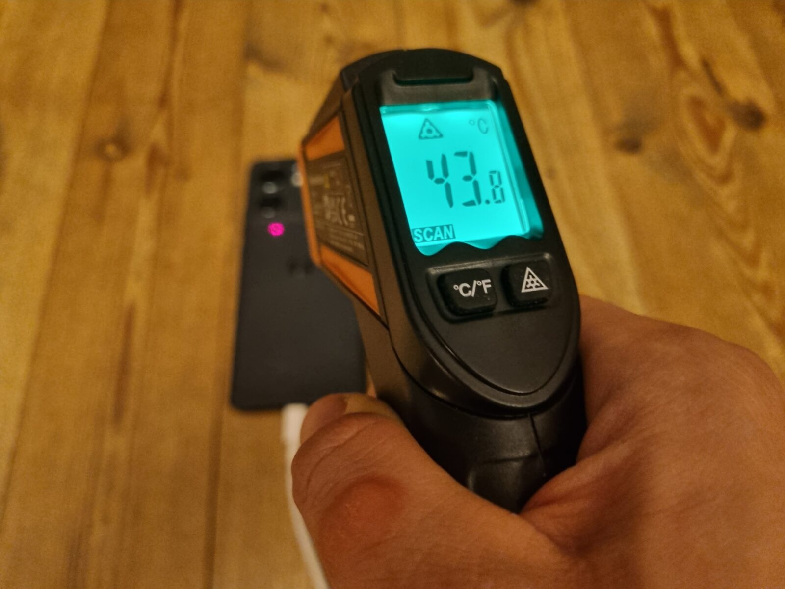 Po 20 min stwierdziłem, że warto jeszcze zasymulować sytuację, gdy akumulator jest już na wyczerpaniu, a chcemy nadal grać. Podłączyłem więc ładowarkę to telefonu, odczekałem jeszcze 10 minut i temperatura obudowy wzrosła jeszcze o ponad 1,5 stopni – do 43,8 C. To już wartość bliska dwukrotności temperatury początkowej…