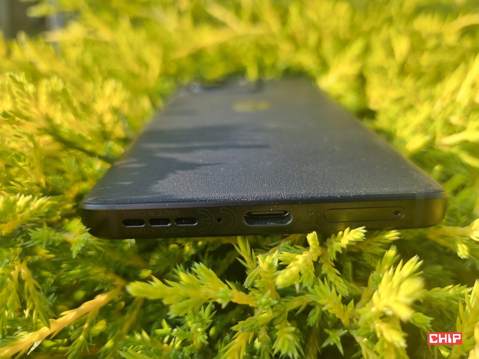 Motorola Edge 40 bardzo dobrze leży w dłoni, nie jest śliska, a na tylnej części obudowy i na ramce odciski palców nie są widoczne. Ja do testów dostałem telefon w czarnej wersji kolorystycznej, wykończony skórą wegańską, także mogę powiedzieć, że naprawdę jest miła w dotyku, a wizualnie sprawia, że mamy wrażenie obcowania z produktem premium.