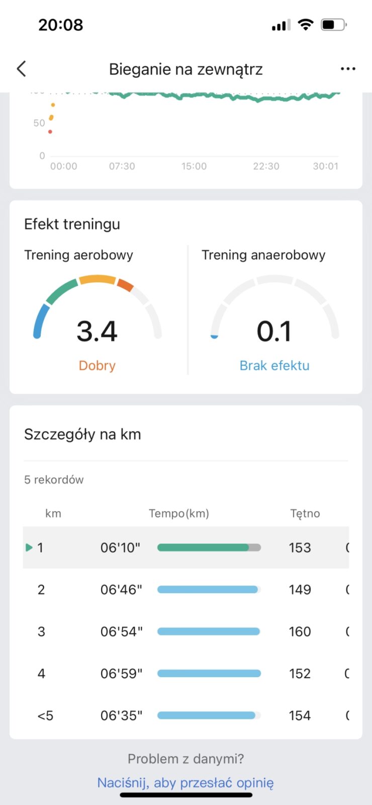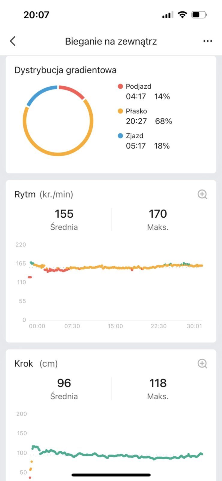 Podczas treningu o wysokiej intensywności byłem już grzeczny i posłuchałem trenera, biegnąc przez 15 minut dość szybkim tempem. Po wszystkim otrzymałem informację, iż przekroczyłem zakładany tygodniowy plan (zapewne za sprawą pierwszego treningu). Trener zaproponował wydłużenie odpoczynku, ale jednocześnie dopasował intensywność kolejnych treningów do moich możliwości i z tego co widzę w planach na kolejne dni treningowe, żadnego treningu nie uda mi się „załatwić” spacerując z psem.