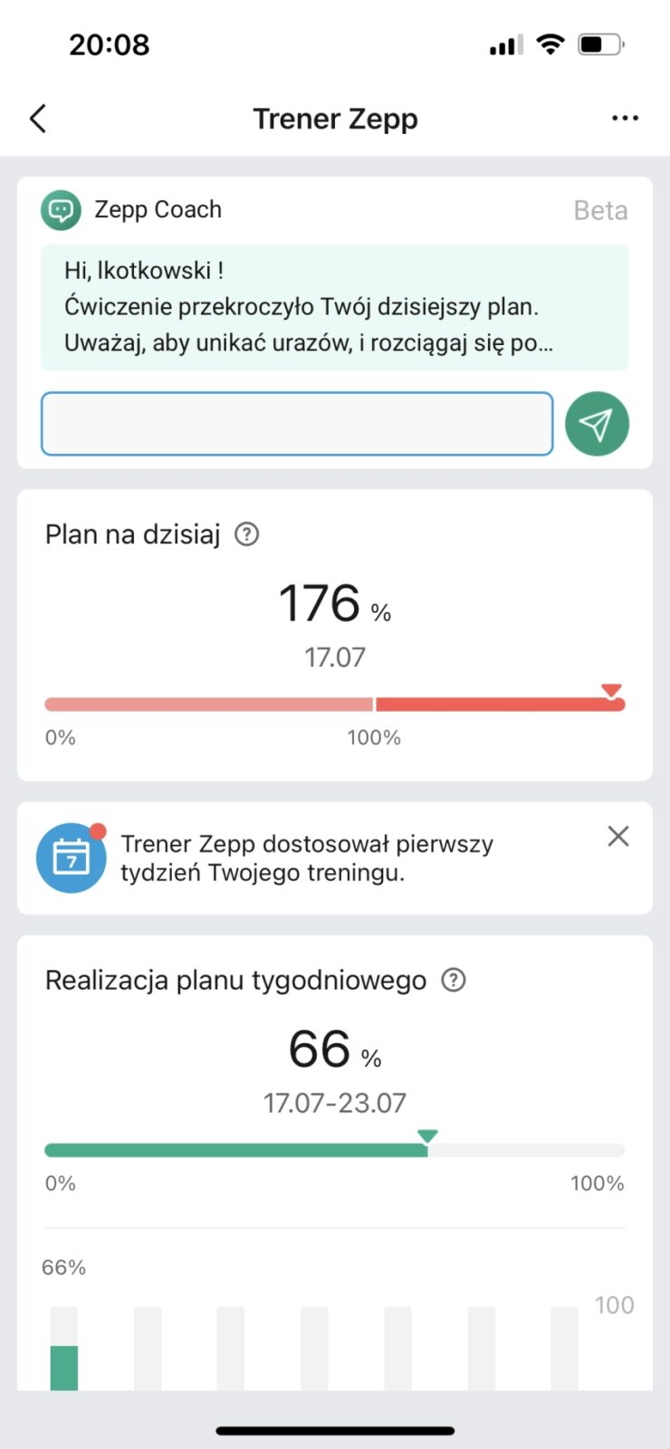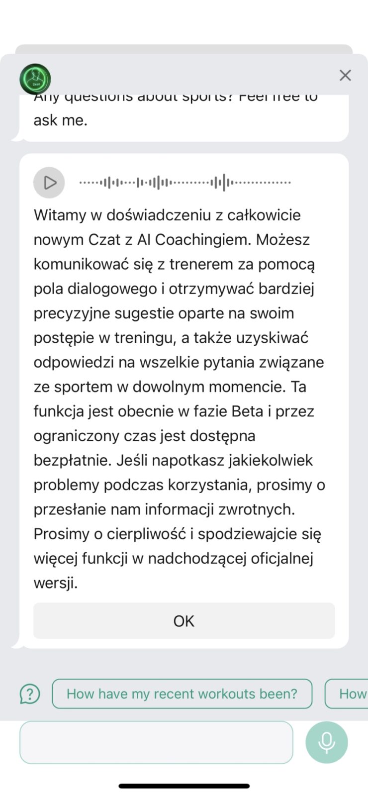 Sam Trener Zepp również potrafi dużo podpowiedzieć, choć aktualnie konwersacja z Chatbotem nie działa w języku polskim, lecz dogadamy się z nim po angielsku. Widać jednak, że Amazfit pracuje nad polonizacją tej funkcji, gdyż powiadomienia o treningach są już dostępne w naszym ojczystym języku.