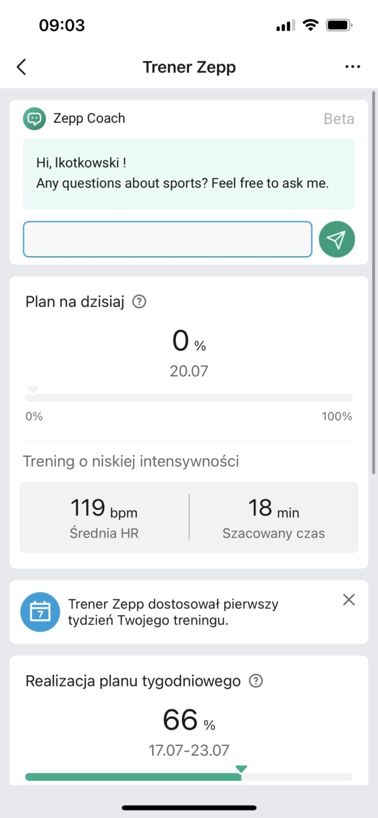 Na to pytanie nie umiem jeszcze odpowiedzieć, ale na pewno dzięki sztucznej inteligencji w zegarku w końcu mogłem wprowadzić jakiś system do moich prób biegania. O ile nikt nam nie broni „iść pobiegać” przez dowolną ilość czasu i z dowolną intensywnością, tak trzymając się zaleceń Trenera Zepp możemy to zrobić bardziej efektywnie i zgodnie z naszymi możliwościami, a Trener dopasuje kolejne dni adekwatnie do wyników. Gdy aplikacja zobaczy, że nie dajemy rady, obniży próg wymagań treningowych. Gdy zobaczy, że za łatwo nam idzie – podkręci te wymagania.