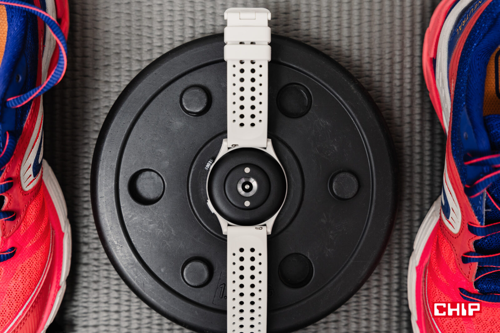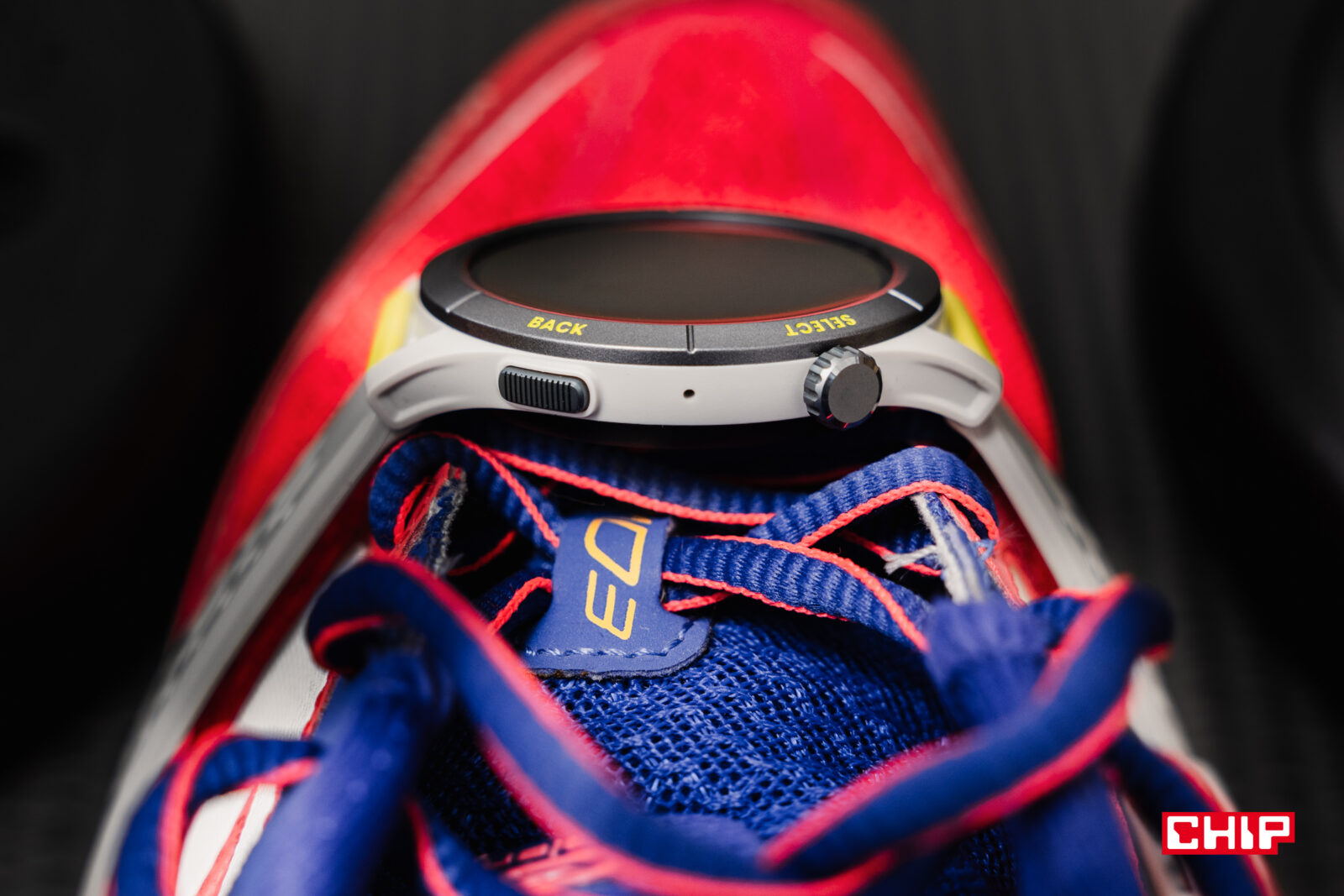 Konstrukcja samego zegarka jest zaś wykonana z wzmacnianego polimeru, który sprawia doskonałe wrażenie w dotyku. Koperta ma wymiary 46,7 x 46,7 x 11,9 mm, a ekran ma średnicę 1,39”. Jest to panel AMOLED o rozdzielczości 454×454 px i wystarczająco wysokiej jasności, by widzieć zawartość ekranu nawet w czasie biegu w słoneczny dzień. Ekran jest pokryty odpornym na zarysowania szkłem i pokryty powłoką odpychającą odciski palców, wszak jest to ekran dotykowy; funkcje zegarka obsługujemy właśnie dotykiem oraz dwoma dodatkowymi przyciskami. Jeśli chcemy, na czas aktywności można zablokować interfejs dotykowy.