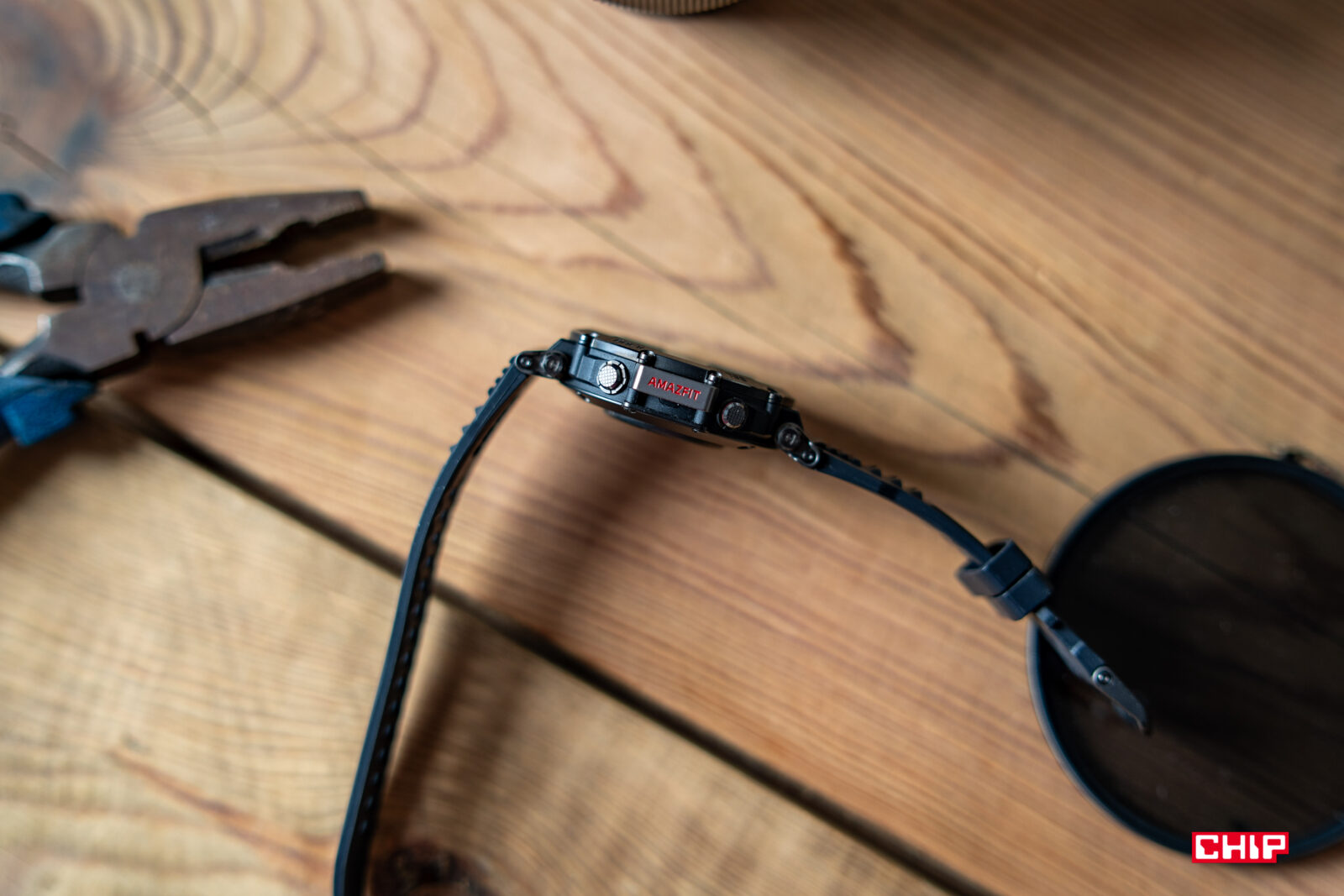 Konstrukcja zegarka jest 3-częściowa i mamy tu stal nierdzewną (316L) wokół ekranu oraz na bezelu, przedzieloną bardzo solidnym tworzywem sztucznym. Przyciski są duże i stworzone tak, aby można było je wygonie wciskać w rękawiczkach. Bo choć ekran jest dotykowy, w razie potrzeby można go obsługiwać również przyciskami. Koperta zegarka ma wymiary 47,3 x 47,3 x 14,45 mm.