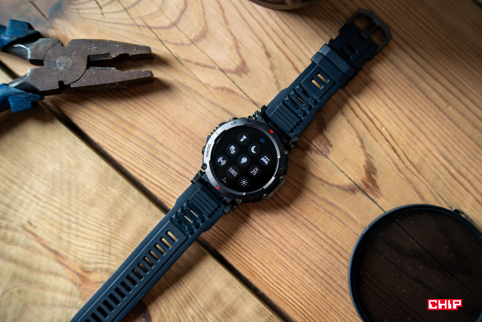 Ekran T-Rexa Ultra może nieco uśpić czujność. To panel AMOLED o średnicy 1,39 cala i rozdzielczości 454 x 454 cala. Ekran… no jak ekran można powiedzieć. Na pierwszy rzut oka niezbyt się wyróżnia, tym bardziej że interfejs zegarka nie atakuje nas wyszukanymi animacjami i efektownymi grafikami. A jednak to nie jest byle ekran. Jego jasność sięga 1000 nitów i to coś, czy bardzo pozytywnie zaskakuje. Dzięki temu jest czytelny w dosłownie każdych warunkach. Bez względu na to, jak mocno świeci na niego słońce, wszystko na nim zobaczycie.