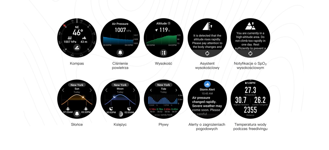 Zegarek oferuje też szereg funkcji przydatnych dla osób aktywnych, ale niezwiązanych ze śledzeniem aktywności, a poniższa grafika prezentuje tylko część z nich.
