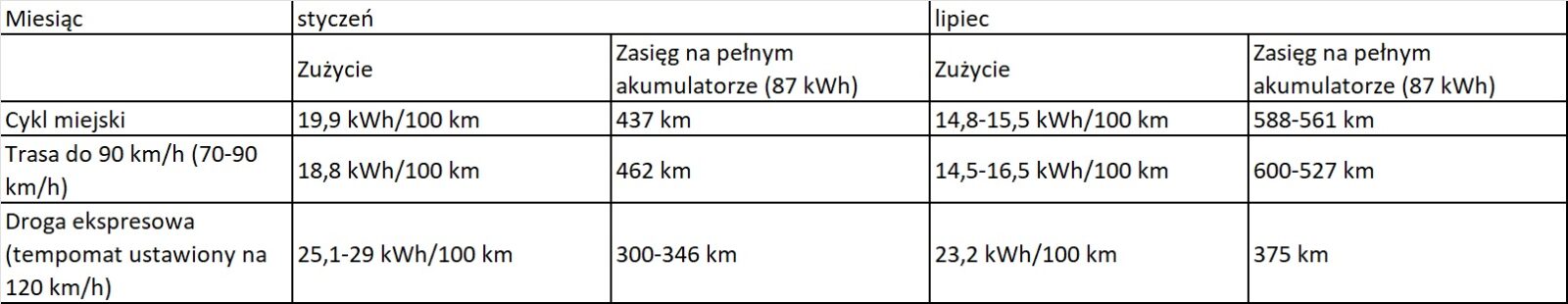 Podczas testu przeprowadzonego w styczniu tego roku pogoda nie rozpieszczała. Temperatura oscylowała w granicach 0°C, ale towarzyszyły jej obfite opady. Był deszcz, był śnieg, był wiatr. Takie warunki nie sprzyjają zużyciu prądu, nie pomagają również w ładowaniu. Dla odmiany, podczas lipcowego testu pogoda byłą wręcz wymarzona – temperatury powyżej 25°C, bezchmurne niebo, minimalny wiatr – sielanka. Zacznijmy od zużycia prądu, które wygląda następująco.