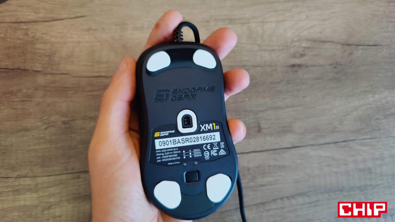 Producent rozwiązał w ciekawy sposób panel na spodzie, który to obejmuje przycisk do zmiany poziomu czułości (jedno kliknięcie) oraz częstotliwości odświeżania (przytrzymanie). Dla wielu osób nie będzie to zapewne rozwiązanie idealne, ale za to pozwoliło jeszcze bardziej uprościć zewnętrzną część myszki.
