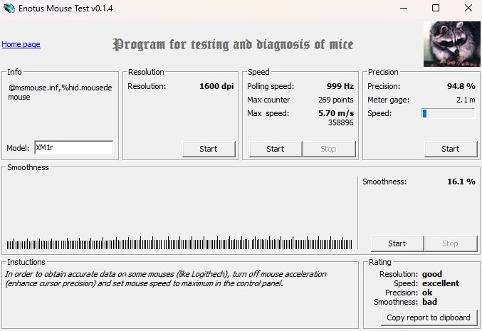 Wygląda więc na to, że co do wysokiej precyzji takiej myszki możecie być pewni. Nie jest to może poziom najlepszych z najlepszych, ale nawet wyczuleni na precyzję myszek użytkownicy nie doszukają się w tym modelu żadnych problemów w tym zakresie. Zwłaszcza że nawet parametr LOD rzeczywiście wynosi ~1 mm, a maksymalna prędkość jednoznacznie świadczy o wysokiej precyzji.