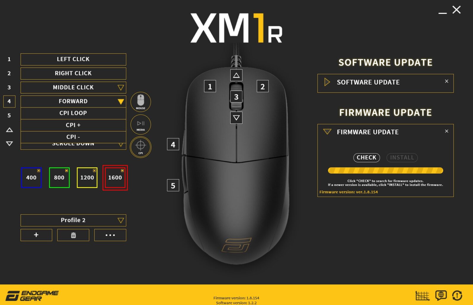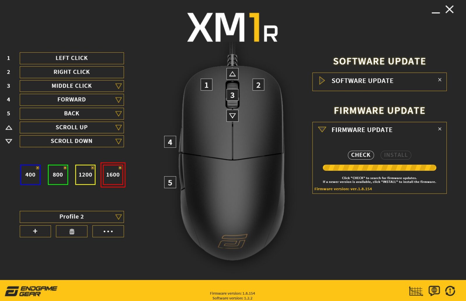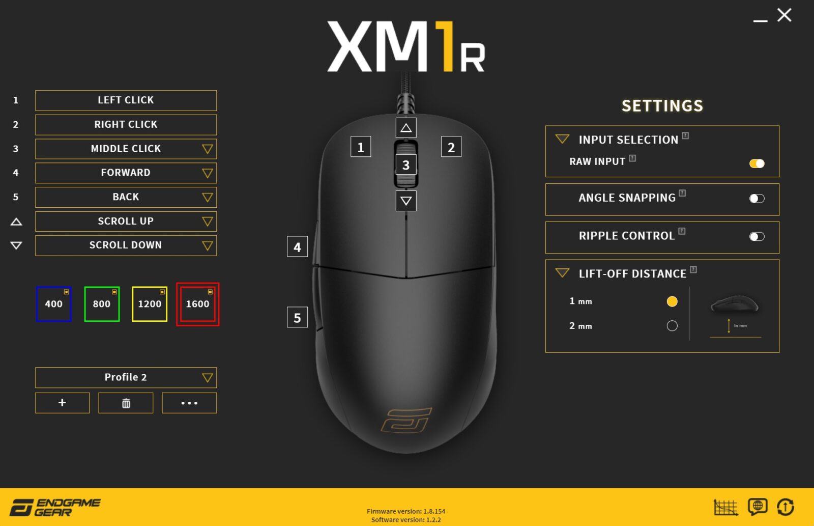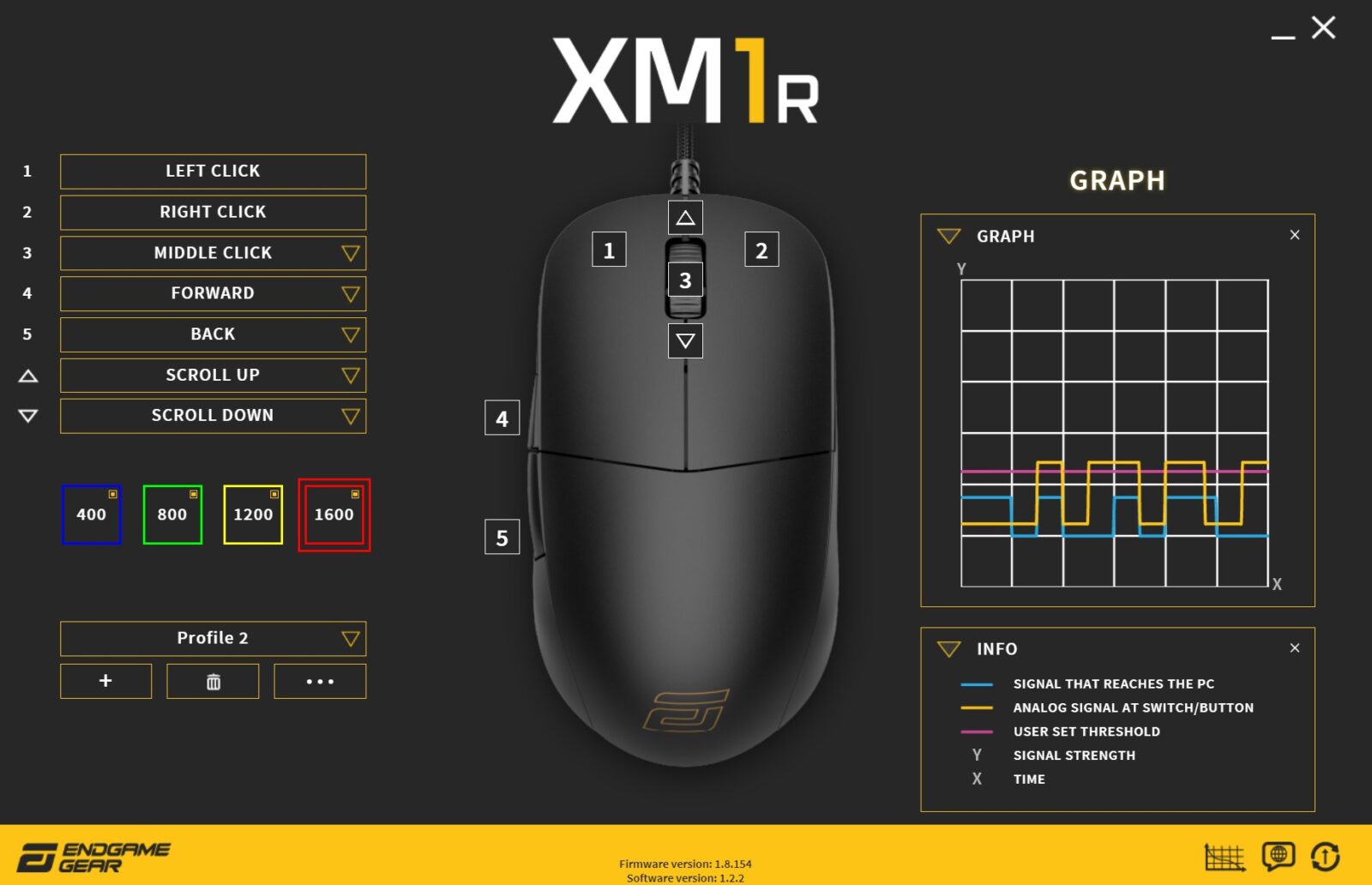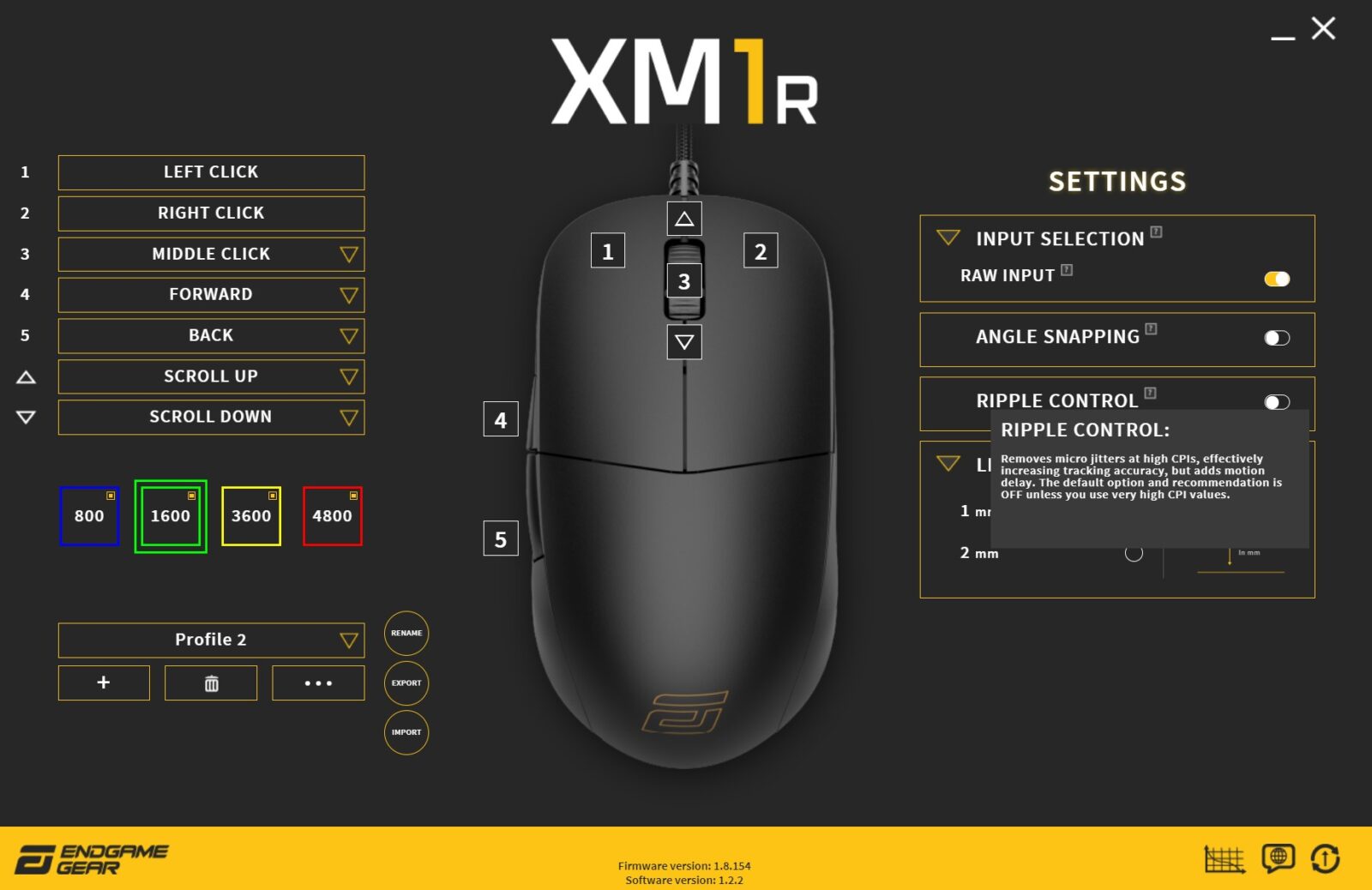 Jak możecie zobaczyć powyżej, aplikacja dla XM1r oferuje podstawowe opcje pokroju profilów, czterech poziomów czułości (od 50 do 19000 CPI z przeskokami co 50 jednostek do 10000 CPI i co 100 powyżej) czy nadpisywania funkcji przycisków, wśród których nie zabrakło opcji zmiany poziomu czułości. Poza tym pozwala wybrać poziom LOD, aktywować ripple control i sprawdzić reakcję głównego przycisku, co pozwala sprawdzić jakość najważniejszego przełącznika w myszce.