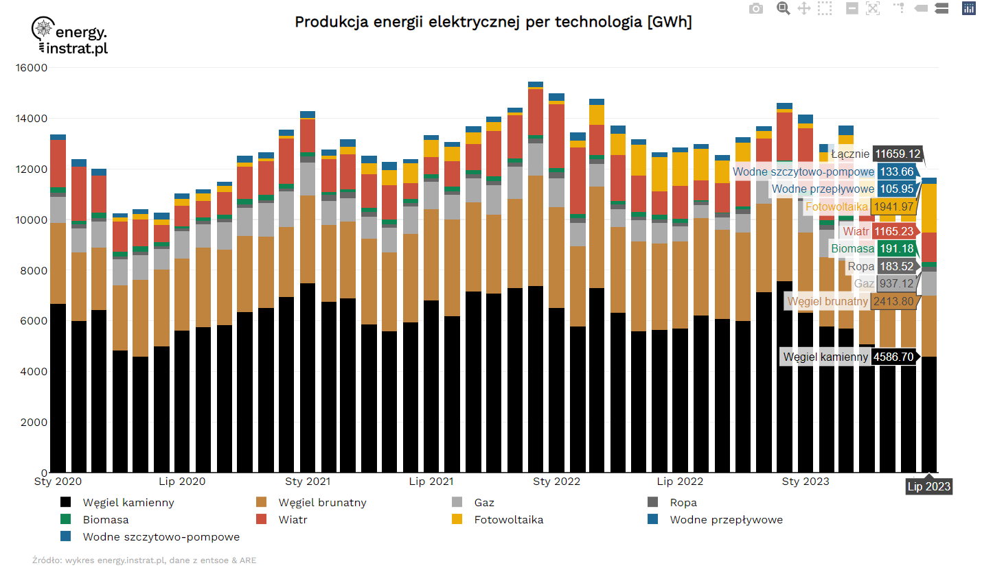 W lipcu 2023 roku wszystkie instalacje fotowoltaiczne wyprodukowały łącznie 1942 GWh. Dla porównania w pierwszym roku pandemii (2020), kiedy boom na panele dopiero się rozkręcał było to „jedynie” 1760 GWh. Tak naprawdę poziom generacji z całego 2020 roku przekroczyliśmy już w maju br.