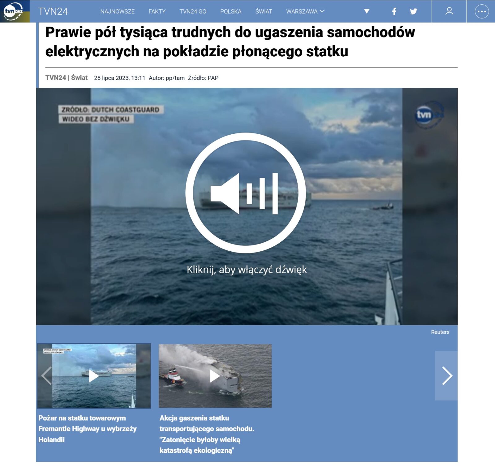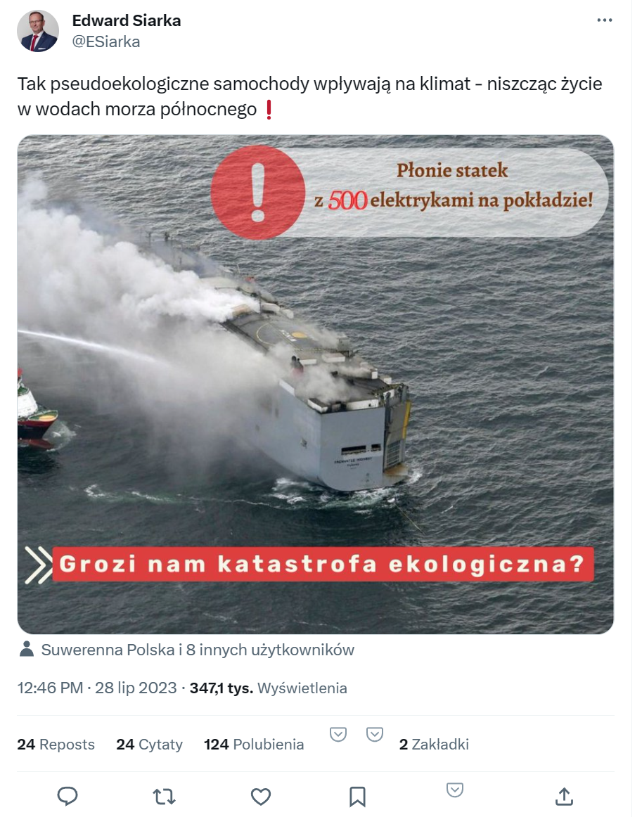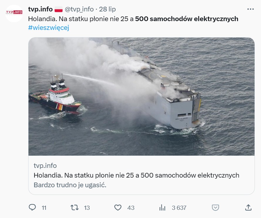 Tak np. sprawę komentowało TVP Info – na statku PŁONIE 25 nie 500 samochodów elektrycznych. Drogie TVP Info, może teraz jakieś sprostowanie, skoro jednak nie płoną?: