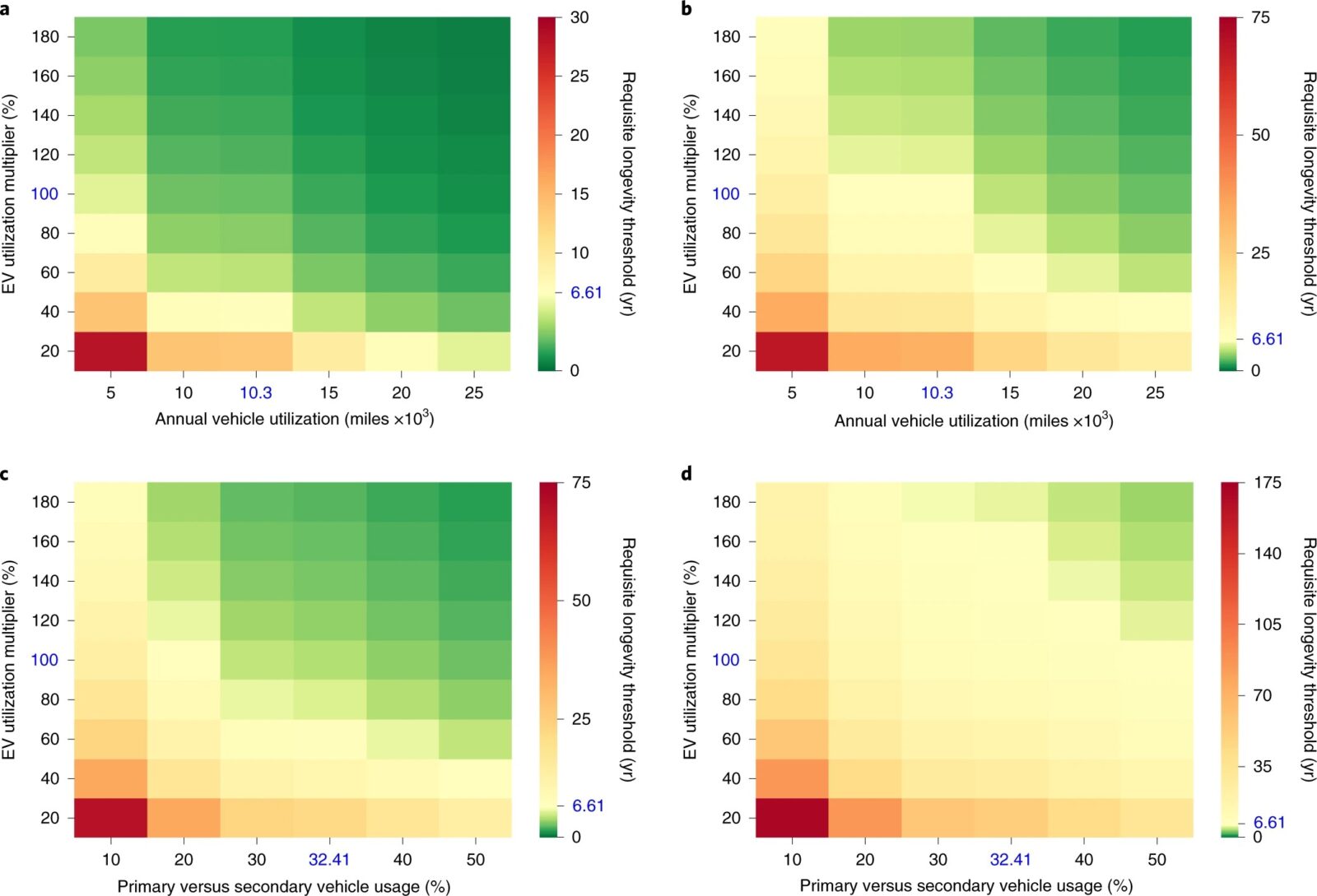 Jaka jest natomiast odpowiedź na pytanie postawione w tytule? Jak wyjaśniają badacze, pojazd elektryczny ma bardzo zróżnicowane progi w zależności od charakteru, w jakim jest używany. Na przykład dla gospodarstw domowych, które nie posiadają obecnie pojazdu, taki samochód elektryczny musiałby przejechać co najmniej 45 tysięcy kilometrów rocznie. Górny próg, wynoszący 110 tysięcy kilometrów, miałby być natomiast stosowany w gospodarstwach domowych, które już posiadają pojazdy z silnikami o spalaniu wewnętrznym (ICEV, ang. internal combustion engine vehicle).