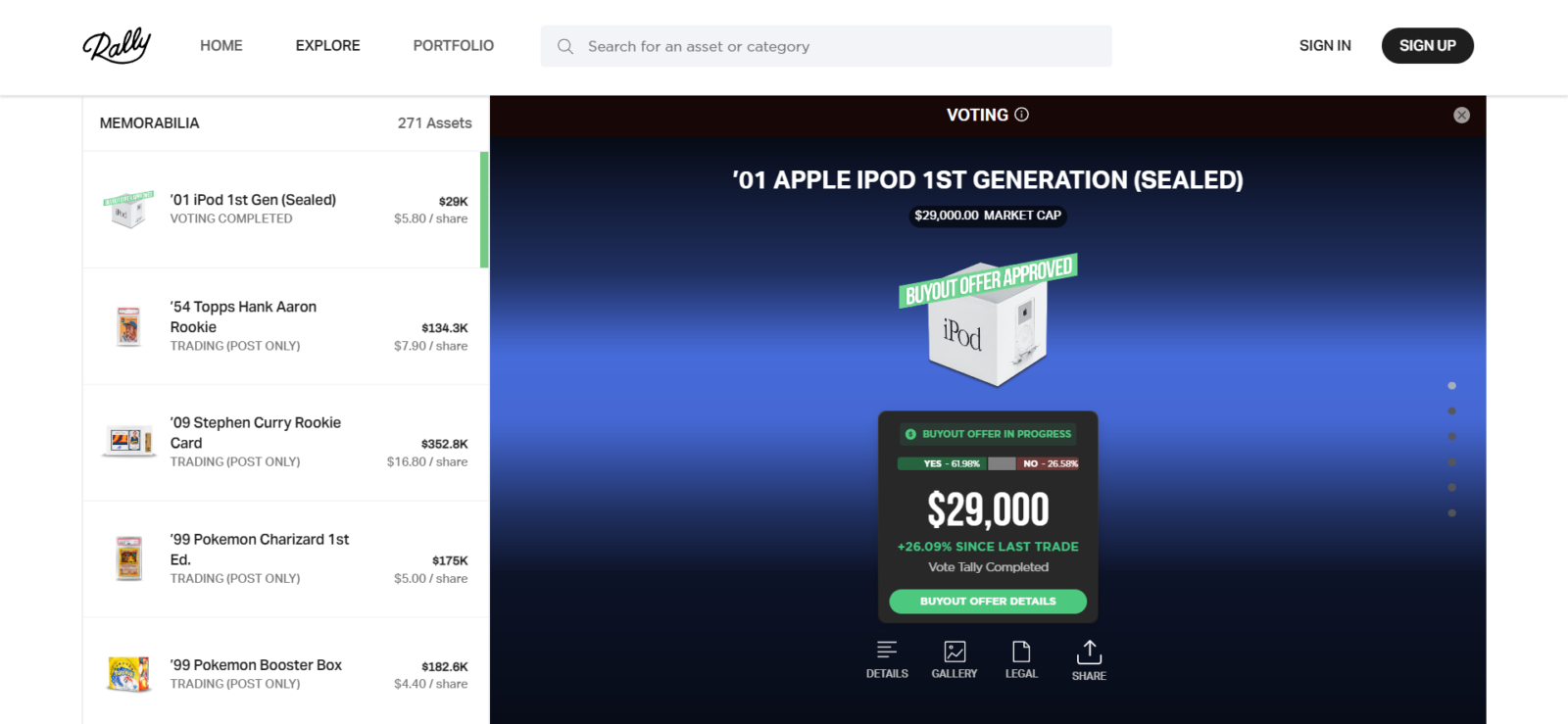 Idea działania Rally zakłada nabywanie udziałów w przedmiocie, tak jakby posiadali jego część (analogicznie do akcji jakiegoś przedsiębiorstwa obecnego na giełdzie). Jeśli ktoś zdecyduje się kupić wszystkie udziały, staje się jego pełnoprawnym właścicielem, ale osoby mające wcześniej swoje udziały mogą nieco zarobić na różnicy w cenie przedmiotu wystawionego na sprzedaż. W tym momencie cena pierwszego zafoliowanego iPoda powędrowała już na poziom 29 tys. dolarów.