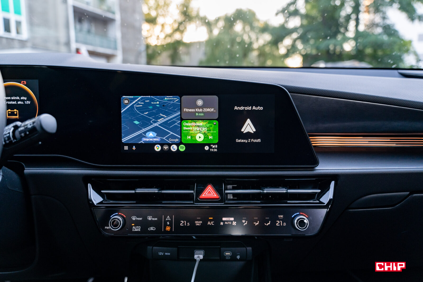 Do tego, nie wiem dlaczego, testowany egzemplarz nie doczekał się najnowszej wersji oprogramowania, która wykorzystuje pełną powierzchnię wyświetlacza podczas korzystania z Android Auto (przewodowo). Interfejs auta pozwala wyświetlać na boku dodatkowe, mniejsze okno np. z pogodą, odtwarzaczem muzyki, wskazówkami nawigacji czy spalaniem. W Android Auto w tym miejscu mamy zmarnowaną przestrzeń na czarne pole z nazwą naszego smartfonu. Wiemy, że to można zaktualizować, wiemy że Kia ma taką opcję, więc to powinno z czasem zniknąć, ale póki co straszy.