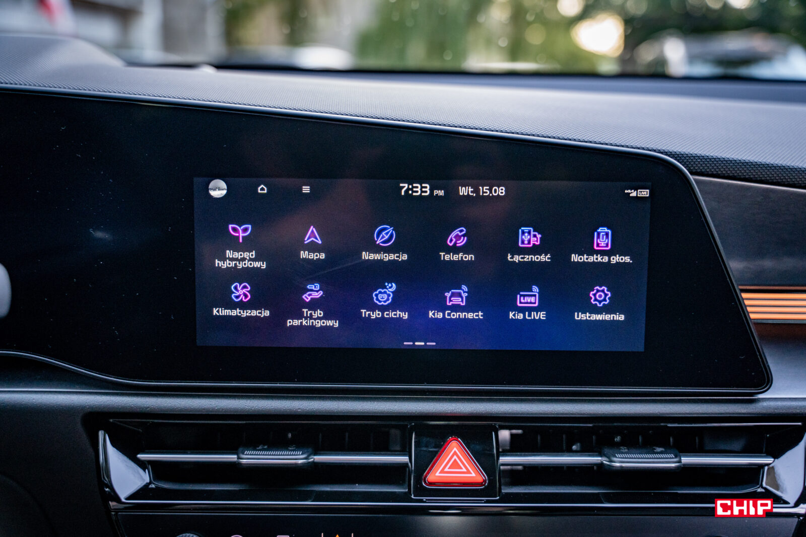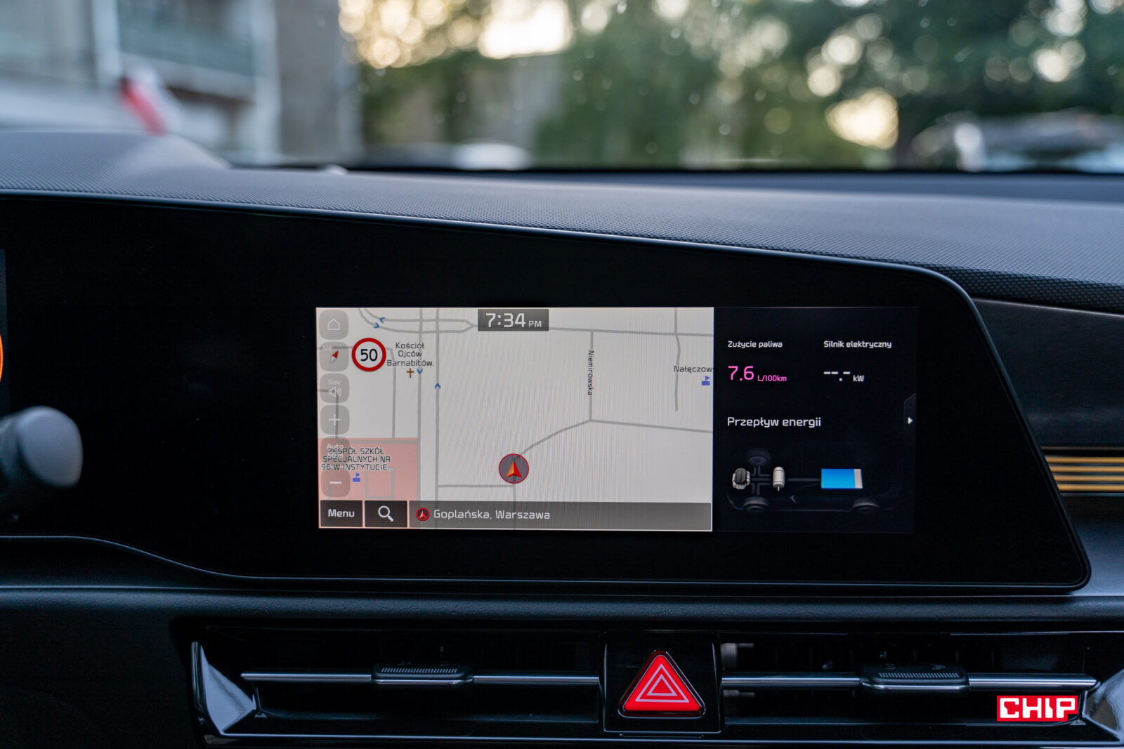 Na papierze nie wygląda to źle, bo Kia Niro ma ekran główny o przekątnej 10,25 cala, a w najwyższej wersji wyposażenia również ekran kierowcy o tej samej przekątnej. W niższych są to standardowe ekran z 4,2-calowym ekranem pomiędzy nimi. Umieszczenie wyświetlacza głównego w bardzo dużej, czarnej przestrzeni wręcz masakrycznie zmniejsza go optycznie. Powiedziałbym, że ma nie więcej niż 8 cali i dosłownie ginie w swoim obramowaniu.