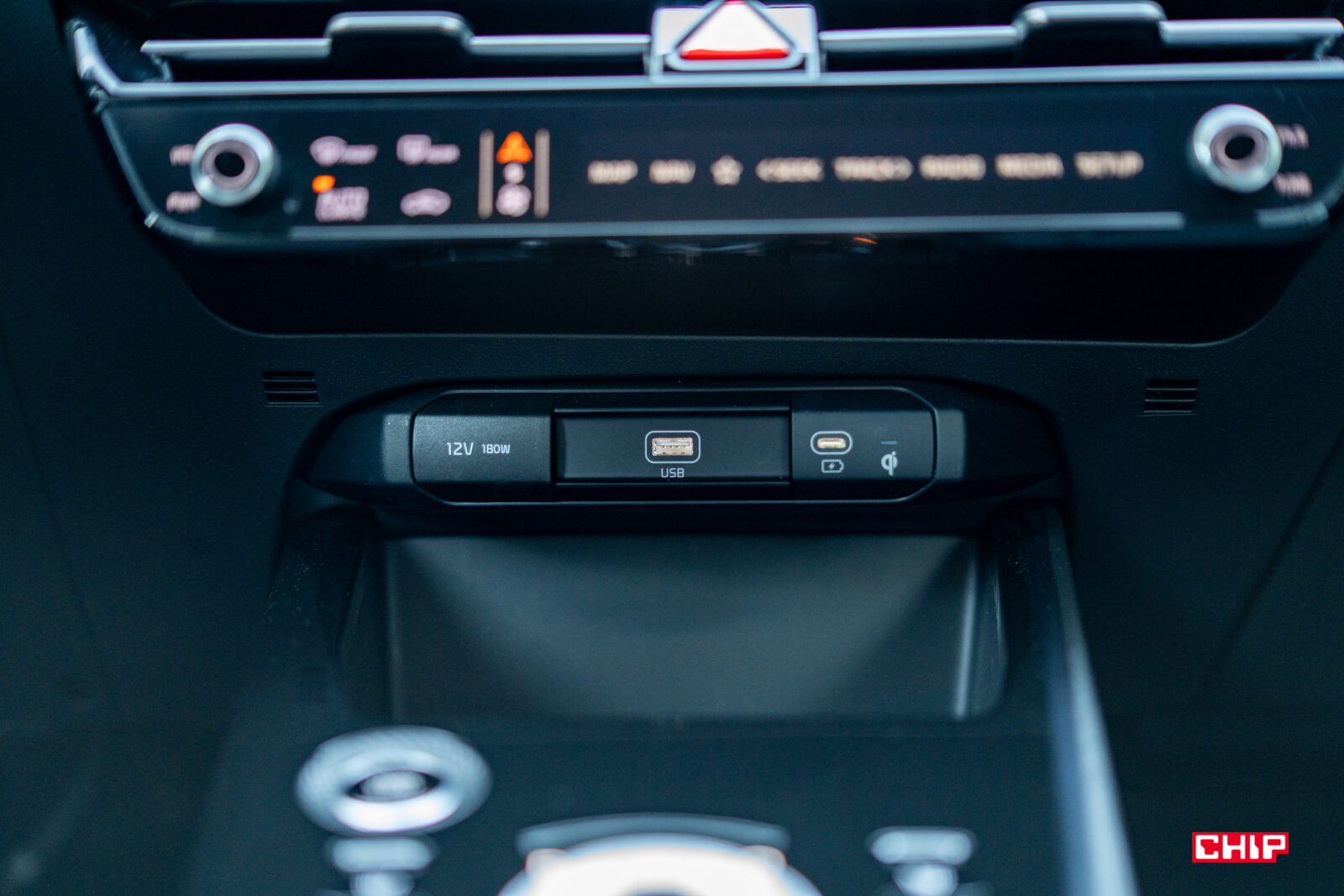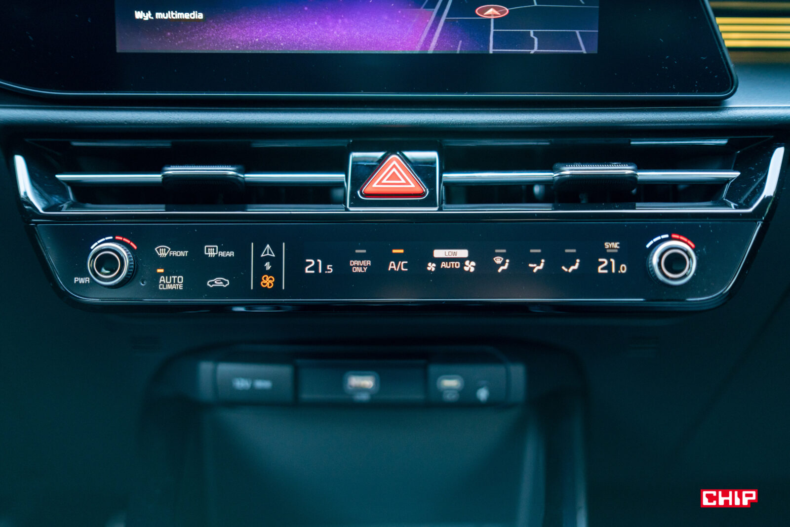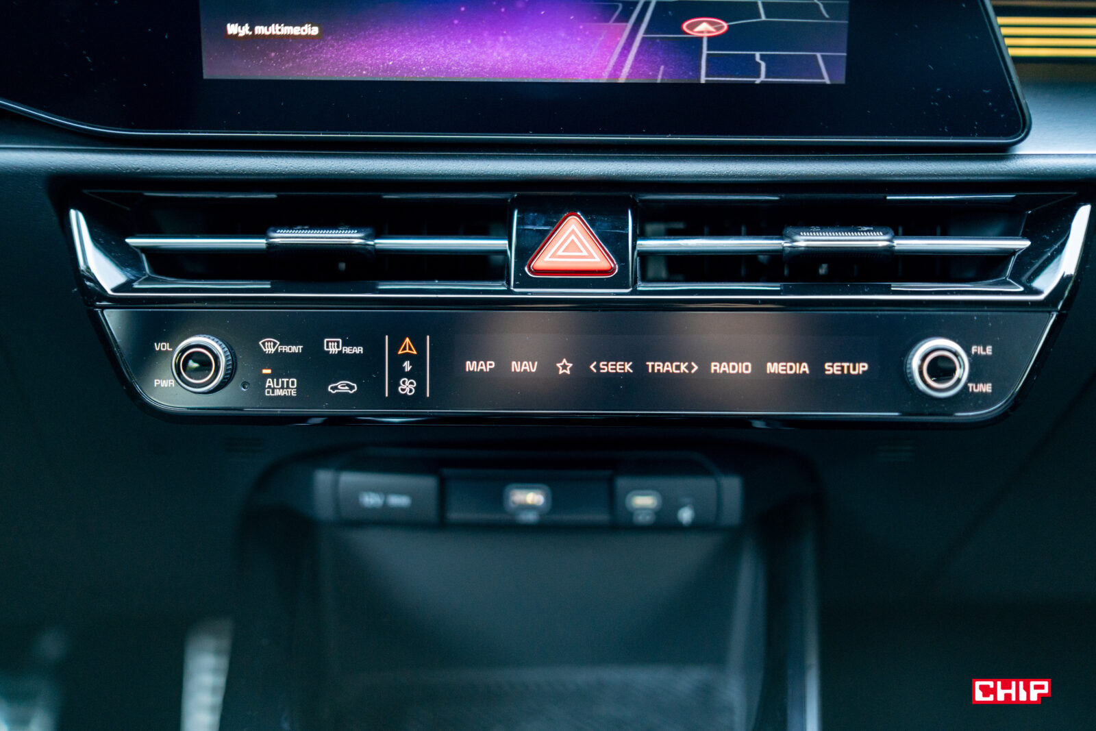 Przyciski sterowania multimediami i klimatyzacją też są w formie cyfrowej. To dotykowa listwa, której widok zmieniamy jednym przyciskiem, dokładnie tak samo jak w modelu Sportage. Ciekawe rozwiązanie i jak łatwo się domyślić, pod względem wygody znajdujące się dokładnie pomiędzy przyciskami fizycznymi, a obsługą na ekranie dotykowym.